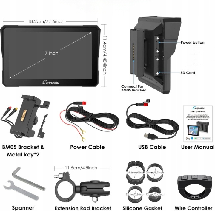 Carpuride W702S Carplay Motorcycle Screen с ручкой BM05 Android 7 "