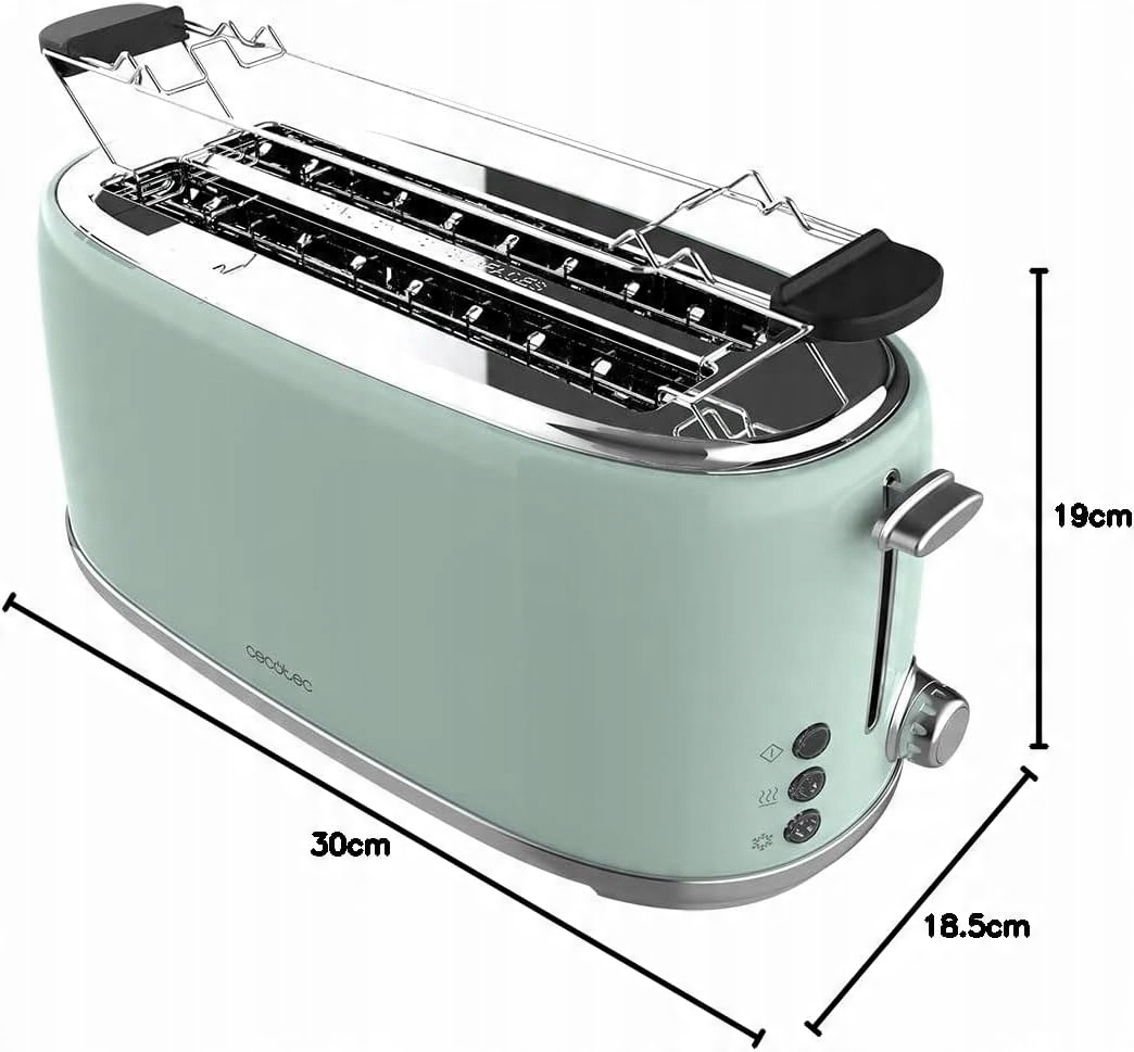 Toaster Cecotec Toast & Taste 1600 Retro Double Green. Стоит засовермену ломтики гарантирует, что хлеб будет равномерно выпекать с обеих сторон. Это также предлагает много практических функций. Например, функция оттаивания хлеба. Высококачественные поверхности нержавеющей стали обеспечивают долговечность и элегантность.