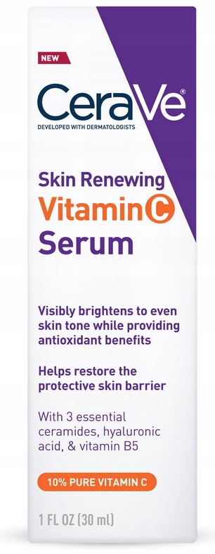 Витамин C – мощный антиоксидант, помогающий защититься от свободных радикалов. При регулярном использовании сыворотка для лица с витамином С может сыграть важную роль в антивозрастном уходе, обеспечивая осветление кожи и уменьшая появление тонких линий, темных пятен и неровного тона кожи. CeraVe Skin Renewing сыворотка с витамином С содержит 10% чистого витамина С (L-аскорбиновой кислоты), который помогает заметно осветлить цвет лица, делая кожу мягкой, сияющей и здоровой.