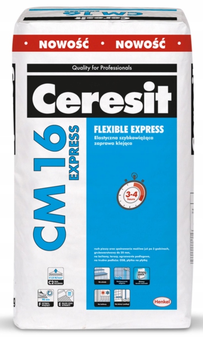 CM 16 Express применяется для крепления керамической плитки (глазури, терракоты, керамогранита), цемента и натурального камня (нечувствительного). до обесцвечивания) плитки на основаниях, таких как: бетон, цементная стяжка, цементная и цементно-известковая штукатурка, полы с подогревом. Подходит для мест, подверженных интенсивному движению и нагрузкам, таких как: пути сообщения, коридоры, школы, супермаркеты, магазины, рестораны и т. д.