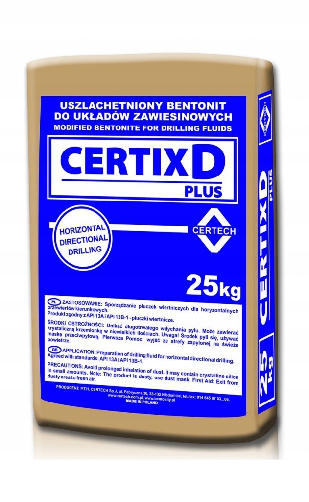 CERTIX D PLUS — это специальная композиция бентонита и полимерных добавок, предназначенная для приготовления суспензии с высокие требования к вязкости. Характеризуется повышенным содержанием полимеров, что придает смеси уникальные свойства. CERTIX D PLUS позволяет использовать очень низкие концентрации дисперсной фазы и получать суспензии с очень хорошими реологическими свойствами. Суспензии, приготовленные с его использованием, можно успешно использовать при бурении длинных участков. Подвеска сохраняет устойчивость и эксплуатационные параметры на протяжении всего периода бурения. Отличные тиксотропные свойства суспензии позволяют стабильно суспендировать шлам в объеме бурового раствора во время перерывов в бурении.