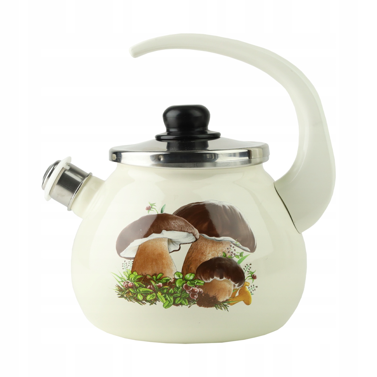 Чайник кремовой эмали емкостью 2,5 л, украшенный красивой графикой лесных грибов. Он позволит вскипятить воду для ароматного чая и бодрящего кофе.