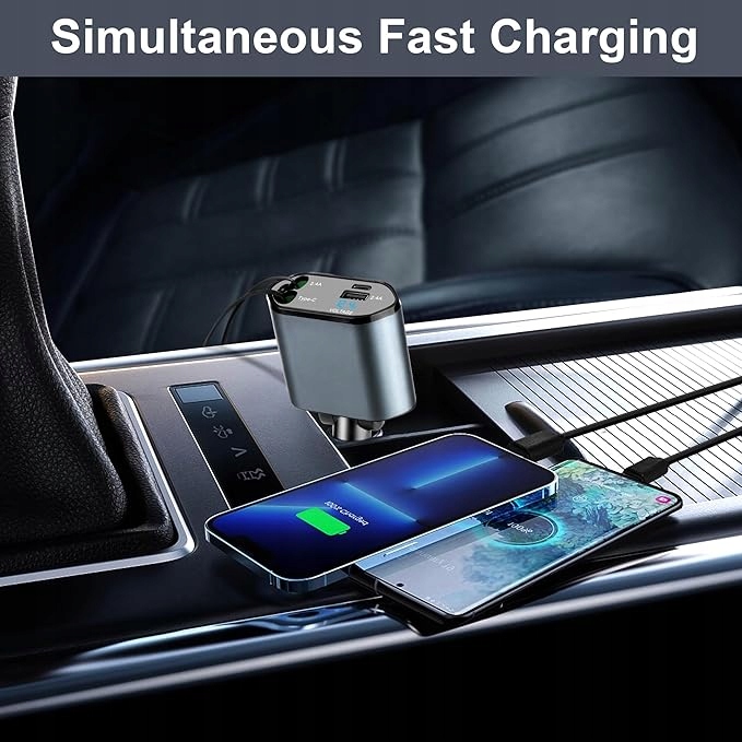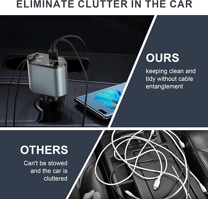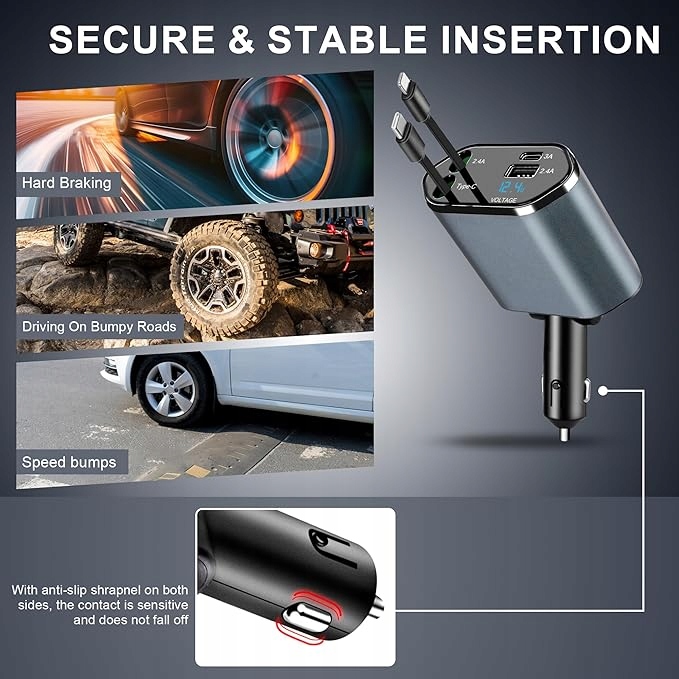 [Гибкое, похороненное автомобильное зарядное устройство] Похороненное автомобильное зарядное устройство вытаскивает кабель в диапазоне 80 см. Скрытый кабель может быть автоматически помещен обратно в внутреннюю часть для хранения. Просто потяните его дважды или к концу, и кабель снова будет спрятаться. Попрощайтесь с беспорядком кабелей в автомобильной консоли, сохраняя его чистым и заказывающим без постукивания кабелей и облегчая удобное управление и использование.