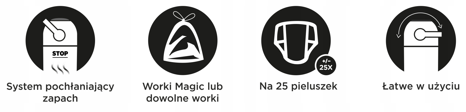 Корзина составляет 40 л (около 25 подгузников*) достаточно в течение нескольких дней и может быть легко опорожней, без выпуска какого -либо запаха, накопленного в корзине, как после того, как положить подгузник в корзину и при его опороховании. Дополнительным преимуществом является возможность использования стандартных пластиковых мешков для мусора, без необходимости покупать специальные дорогие патроны.