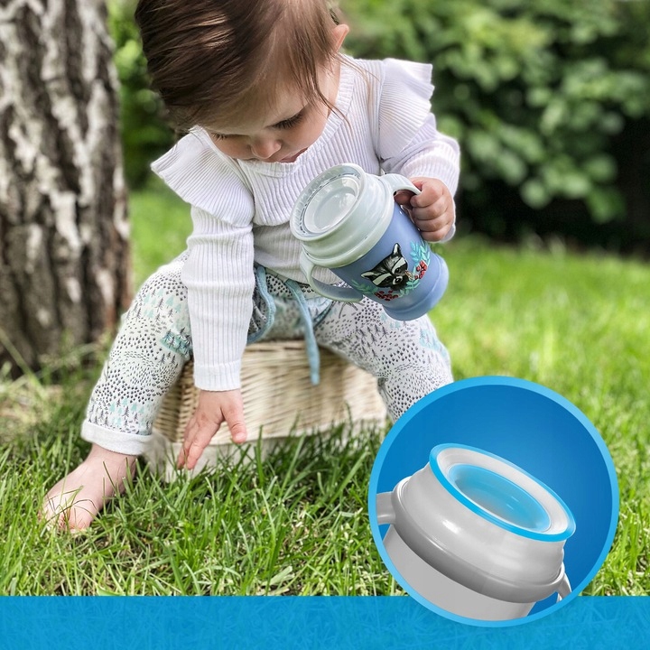 Легко мыть, позволяет пить, не проливая, но намеренно не является непроливаемым (капли жидкости выпадают при сильном встряхивании или падении). Оно учит ребенка контролировать движения и готовит его пить из открытой чашки.