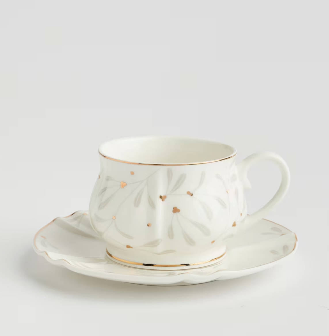 Элегантная чашка с узором и декором в золотисто-сером цвете. Все это создает очень со вкусом набор для питья кофе или чая.