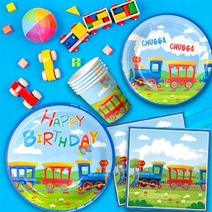 - ▶Украшения для вечеринки в поезде◀ В этот набор для вечеринки по случаю дня рождения в поезде входят 1 поезд с баннером на день рождения, 1 скатерть для вечеринки в стиле поезда, 16 чашек для вечеринки в стиле поезда, 16 поездов салфетки для вечеринки, 16 9-дюймовых тарелок для дня рождения с поездом, 16 7-дюймовых тарелок для вечеринок с поездом и другая посуда для вечеринки в стиле поезда.