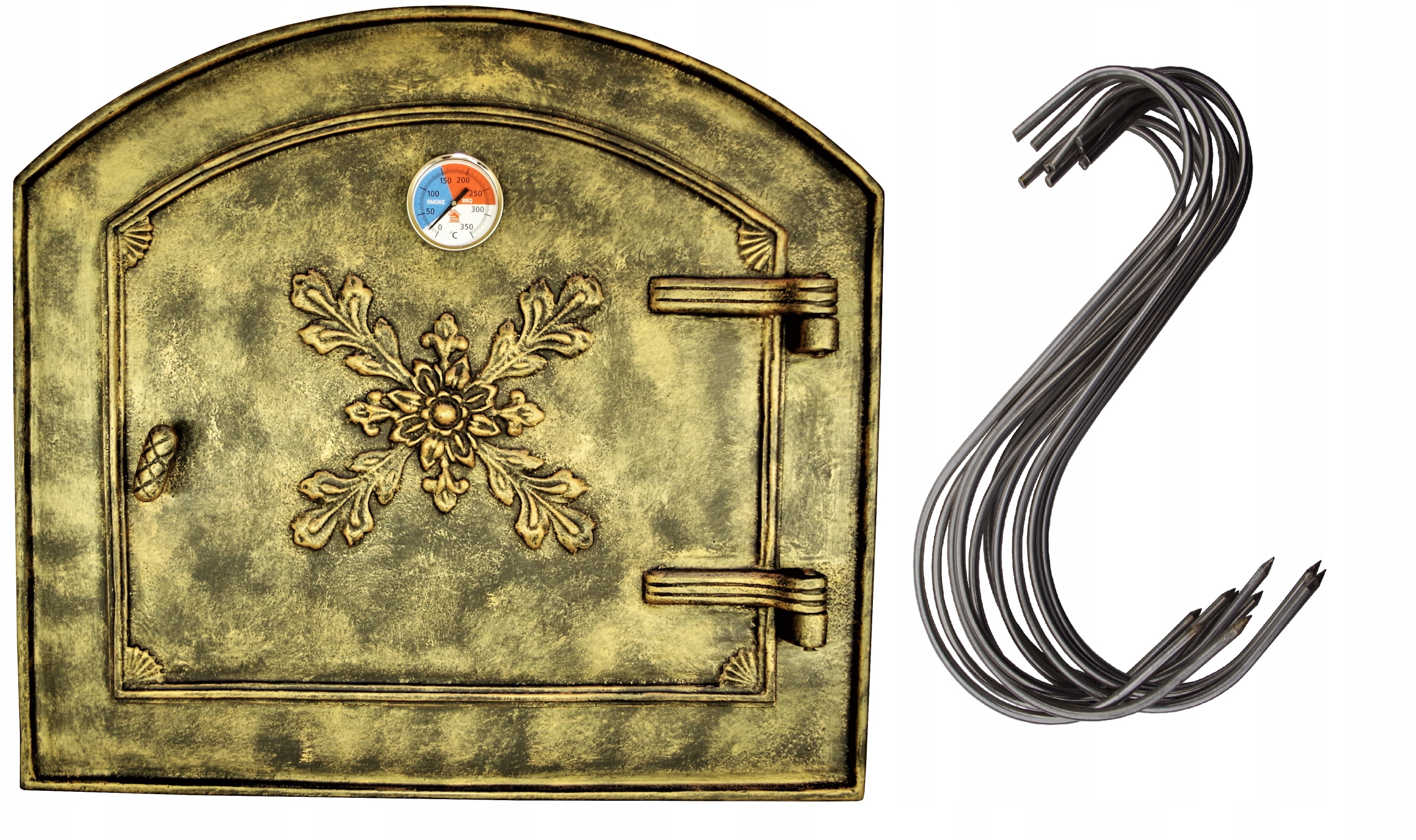 Здравствуйте, дамы и господа. Предлагаю полукруглые чугунные дверцы для пиццы, хлебных печей и т.п. Дверцы открываются вправо. В задней части двери имеются усы для установки с обеих сторон рамы. Изделия отливаются на польском литейном заводе, дополнительно обрабатываются и окрашиваются в моей компании индивидуально под клиента. Чугун патинирован под цвет старого золота термостойкой краской до 900 градусов.
