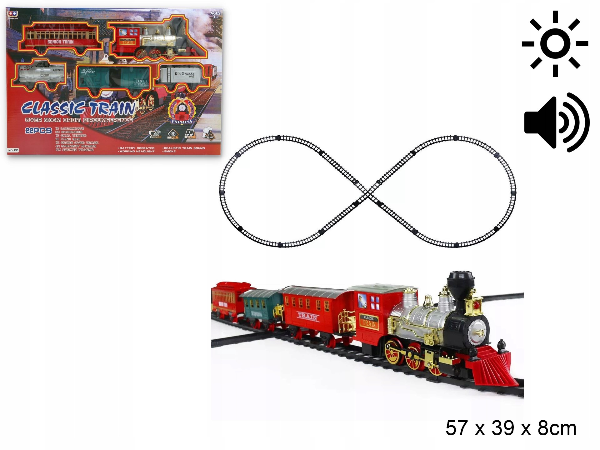 красочный локомотив с соединительными вагонами. Во время катания он светит передним светом и издает звуки путешествующего поезда, а его приводные колеса оснащены эластиками, которые предотвращают скольжение очередь по рельсам.