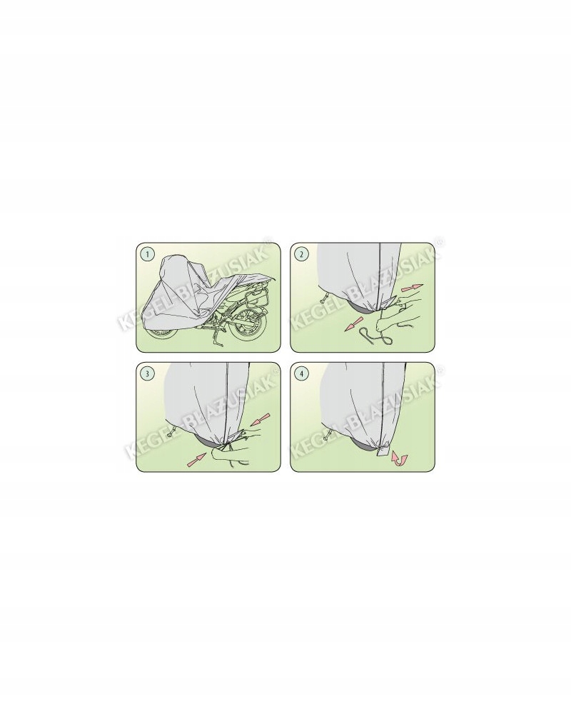 Наденьте относительно чистый мотоцикл белой стороной центрального ремня внутрь, затем натяните трос натяжителя чехла как можно туже и завяжите его должным образом. Только правильная шнуровка станет гарантией долговечности переплета. Привяжите веревку согласно инструкции и вы будете уверены, что чехол закреплен надежно и прочно, а значит, ваш автомобиль в полной безопасности. Рекомендуемая завязка позволит прочно соединить два конца веревки и при этом позволит быстро ее развязать.