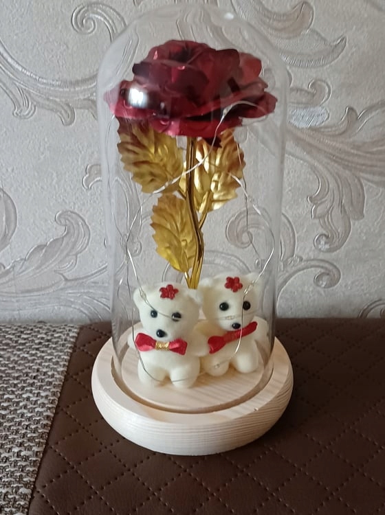 - Стеклянный купол, деревянная подставка и роза с подсветкой. со светодиодными лампами создают идеальное целое.