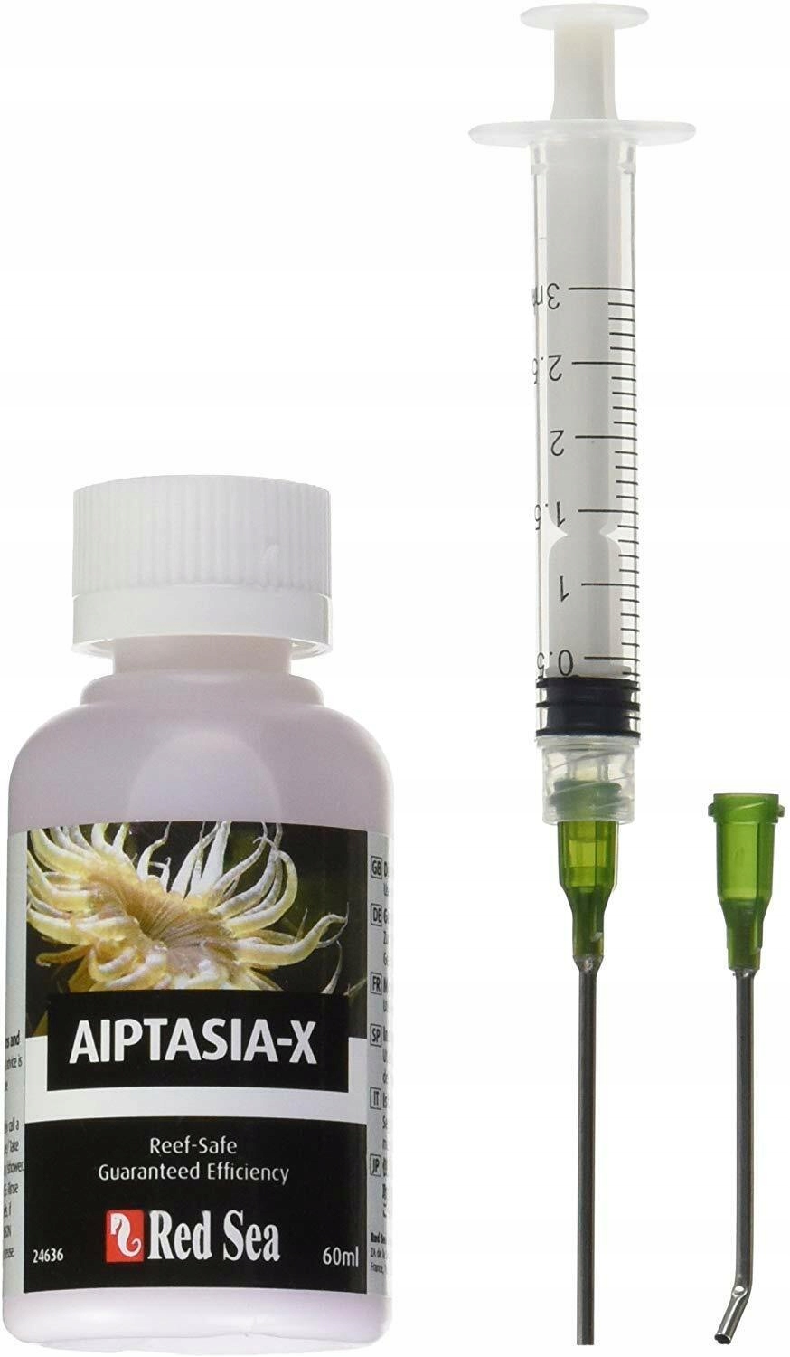 В комплект Аиптасия-Х входит флакон с материалом объемом 60 мл и набор аппликаторов, состоящий из шприца с двумя (прямыми и угловыми) наконечниками-аппликаторами, позволяющими обрабатывать даже самые труднодоступные анемоны. Объема 60 мл, входящего в комплект, должно хватить для обработки примерно 100 анемонов Aiptasia.