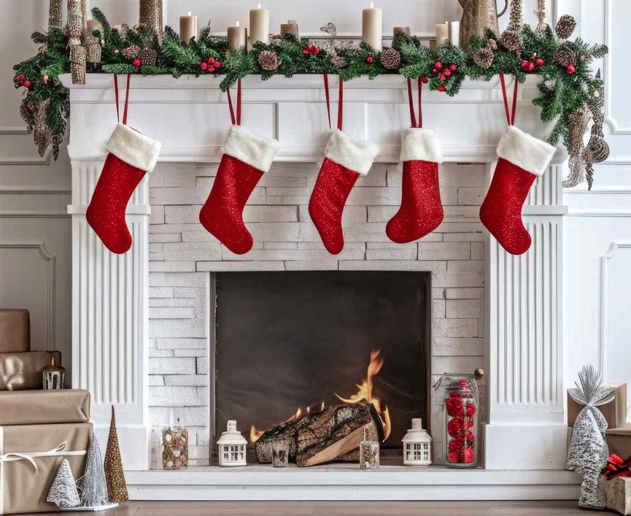 КРАСНЫЕ РОЖДЕСТВЕНСКИЕ НОСКИ ДЛЯ ПОДАРКОВ КАМИН БОЛЬШОЙ 44 БЛЕСТЯЩИЙ РОЖДЕСТВЕНСКИЙ НОСОК
