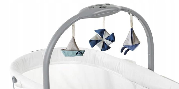 Baby Hug Pro обеспечивает интерактивное развлечение благодаря электронной панели. Он предлагает 6 колыбельных и 6 забавных музыкальных звуков, которые стимулируют воображение и развивают любознательность ребенка. Дополнительно для дополнительного развлечения вы найдете 3 мягкие и стильные игрушки: ветряную мельницу, парусник и воздушный змей. Панель работает от батареек (батарейки в комплект не входят),