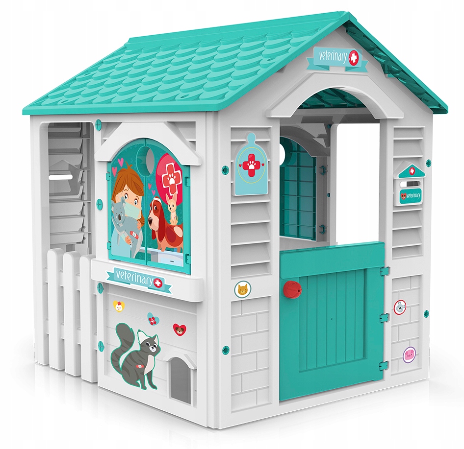 Ветеринарный центр Garden House 89619 Изготовлен в Испании, не имеет острых краев, что делает его полностью безопасным для детей. Домик в пастельных тонах, украшенный наклейками с животными. Двускатная крыша морского цвета с видимыми элементами черепицы. В доме полураспашная дверь цвета морской волны с красной круглой ручкой. На стене рядом с дверью почтовый ящик и информационное табло о клинике. Открывающиеся ставни с отверстием вверху, которое дополнительно освещает салон при закрытых окнах. Окна снаружи покрыты красочными принтами животных и маленького ветеринара, помогающего пациентам. Набор дополнительно оснащен 11 аксессуарами, необходимыми маленькому доктору для ухода за животными, в том числе: очки, шприц, термометр, стетоскоп.Состав и особенности продукта: