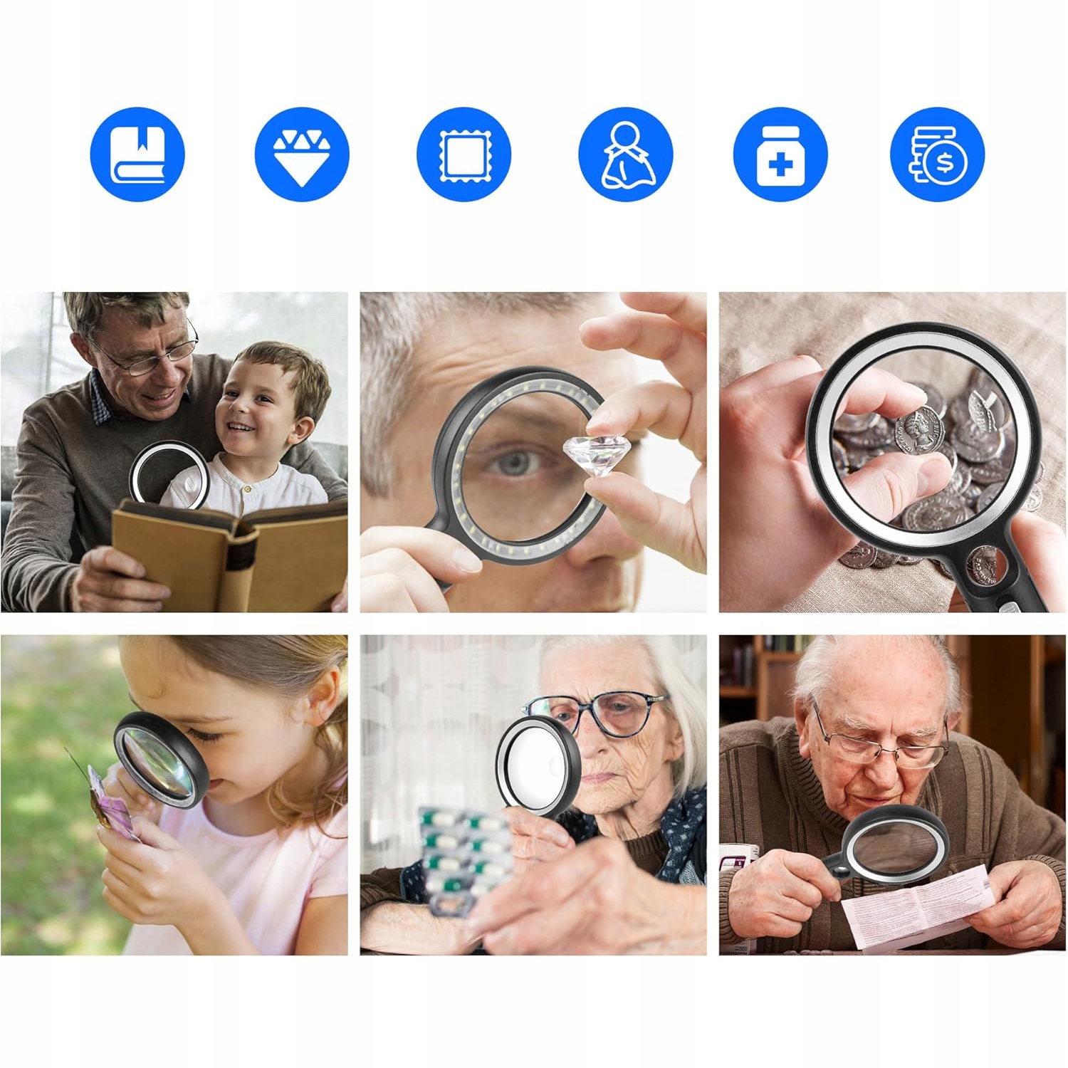 🔎 Встроенные -в 30 светодиодах обеспечивают дополнительное освещение в темной среде, а 1 УФ -светодиод позволяет идентифицировать банкноты, паспорта, изображения и геологические тесты. Переключатель/переключатель и источник питания с тремя батареями AAA (не включены). Инструкции по чтению, квитанции, рецепты, бутылки лекарств, чтение книг, газеты, журналы и другие мелкие принты. Лупа для пожилых людей также полезна в уроках природы и разведке природы для детей, чтобы стимулировать их любопытство к внешнему миру.