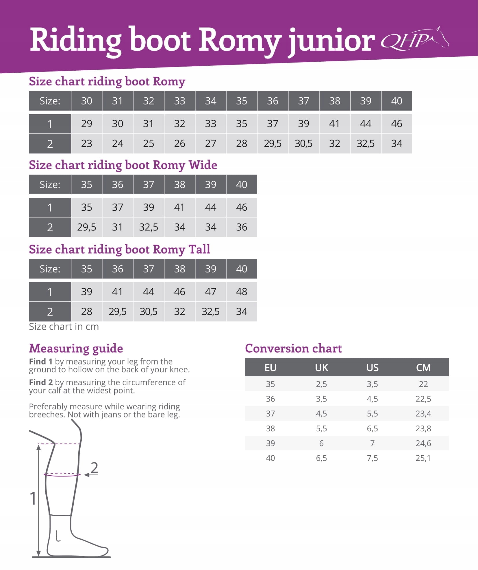Вам следует измерить икру - ее рост и окружность и сравнить с размерами, указанными в таблице. Измеряем икру от земли до свободного сгиба колена, окружность икры в самом широком месте, плотно, без люфтов и пространства. Лучше всего снимать мерки в бриджах и высоких носках.