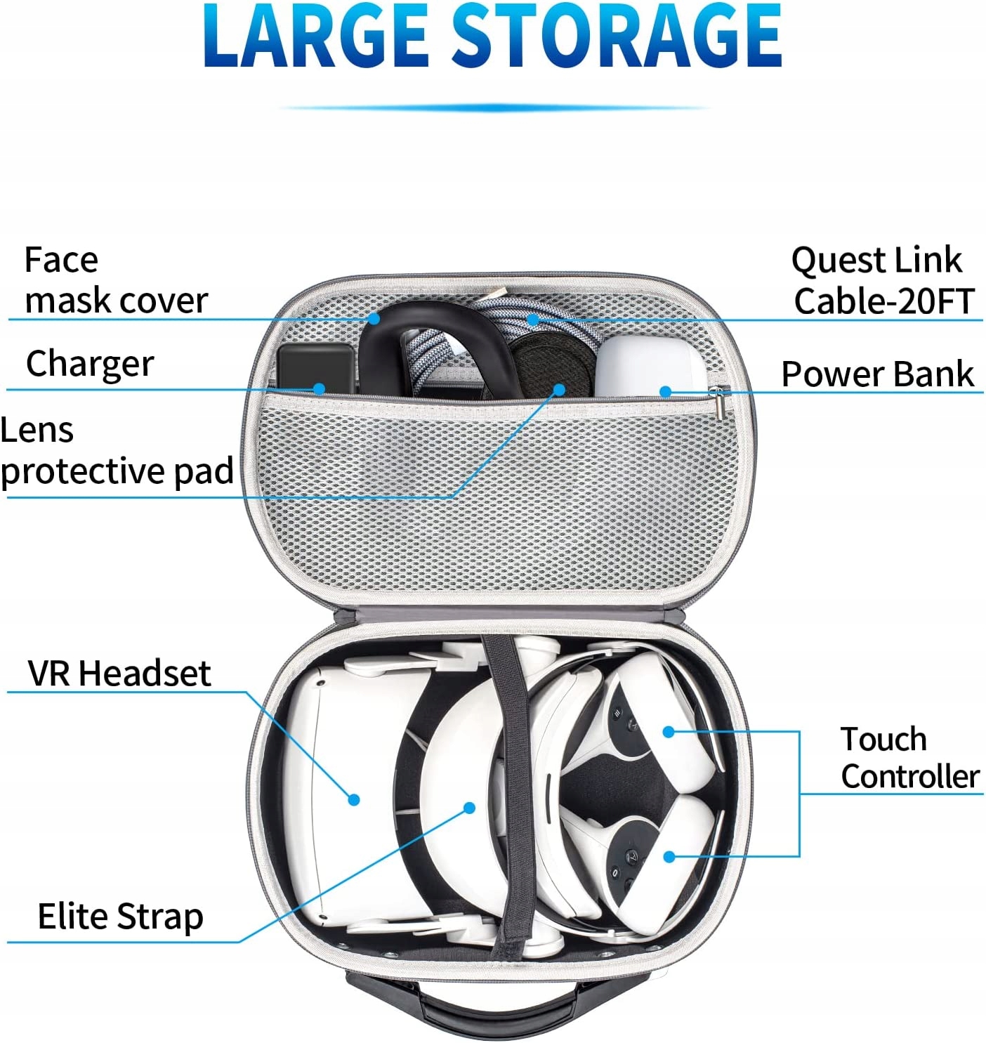 Совместимость: чехол DEVASO специально разработан для гарнитур Meta Quest Pro и Meta/Oculus Quest 2 с ремешком Elite (или ремешком стороннего производителя), зарядным устройством, кабелем и аксессуарами с надежной защитой.