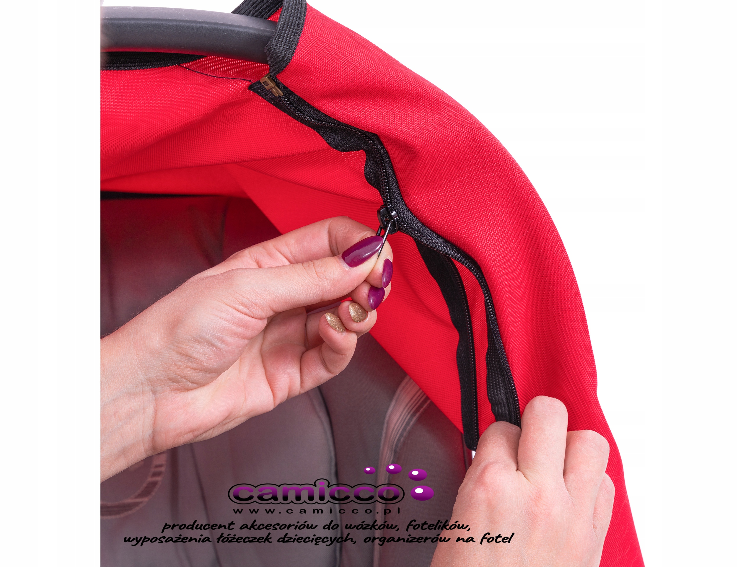 Благодаря вшитой резинке балдахин хорошо прилегает к краям сиденья и имеет жесткость, что предотвращает падение балдахина на ребенка. Застегивается на молнии на ручке для переноски сиденья. Также имеются специальные вырезы для ручки (см. фото)