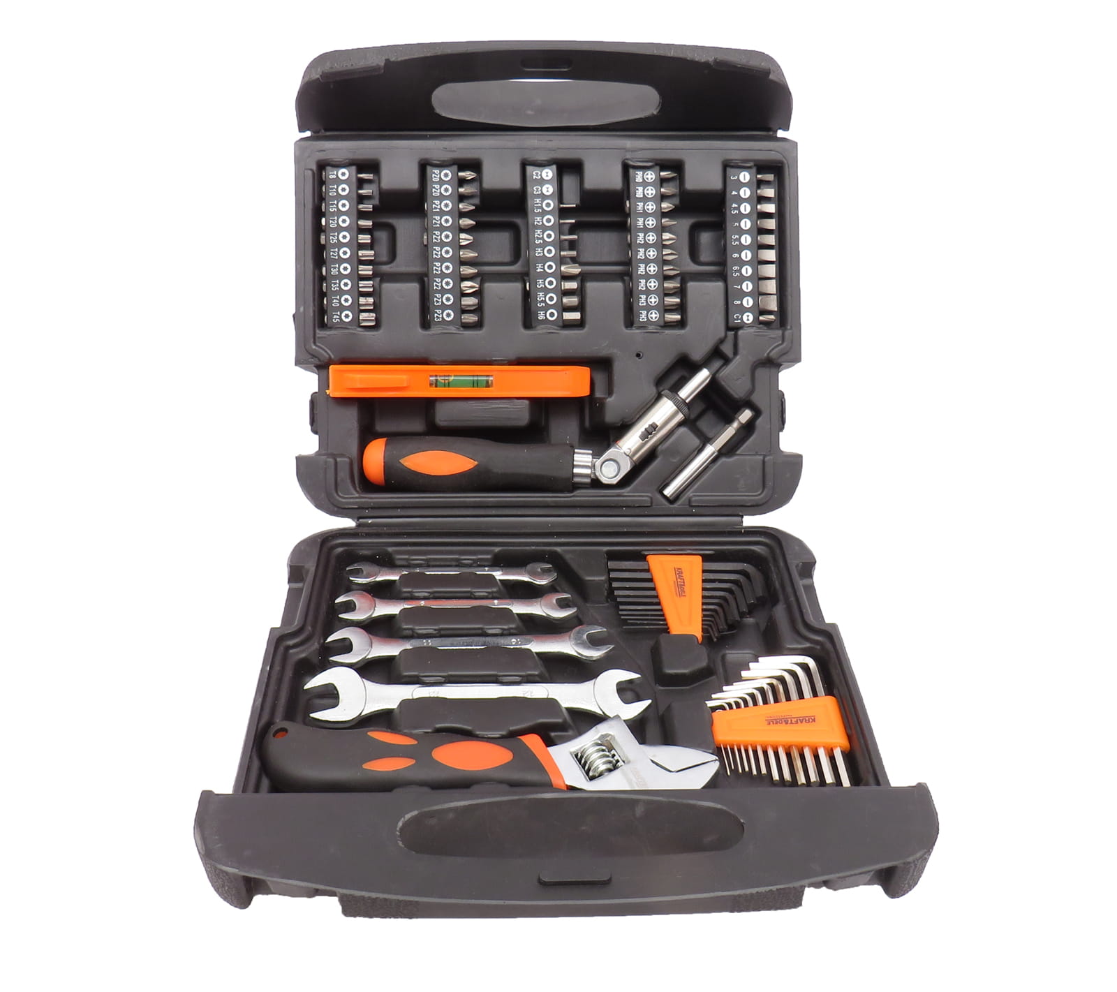 - Рожковые ключи, торцевые ключи, трещотка, набор плоскогубцев, струбцины, шестигранные ключи, нож, а также отвертки и насадки-биты.