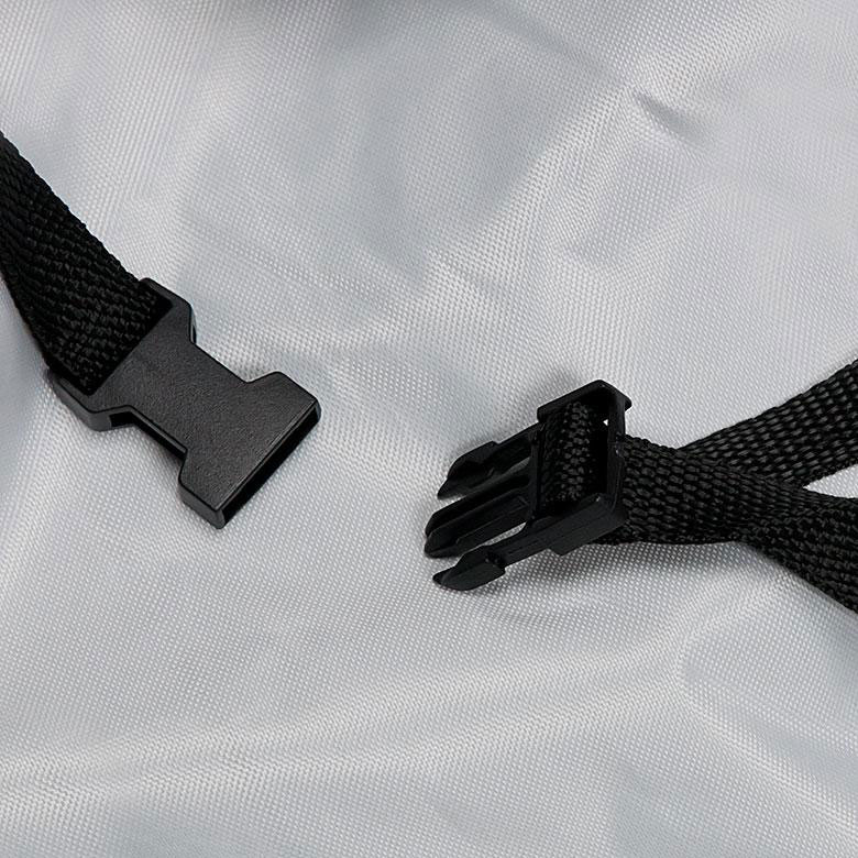 Внизу посередине к чехлу пришиты лямки с пряжкой для крепления под мотоцикл. Ремни эффективно удерживают чехол на месте, сводя к минимуму риск его соскальзывания даже при очень сильном ветре.