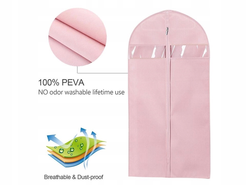 Высококачественный товар изготовлен из экологического материала ПП (нетканый спанбонд). Плотность этого материала до 80 г/м2. Волокна расположены особым образом, что делает упакованный продукт безопасным от атмосферных факторов, таких как дождь или снег, и в то же время специальная каландрировка нетканого полотна пропускает воздух, что позволяет одежде в чехле дышать.
