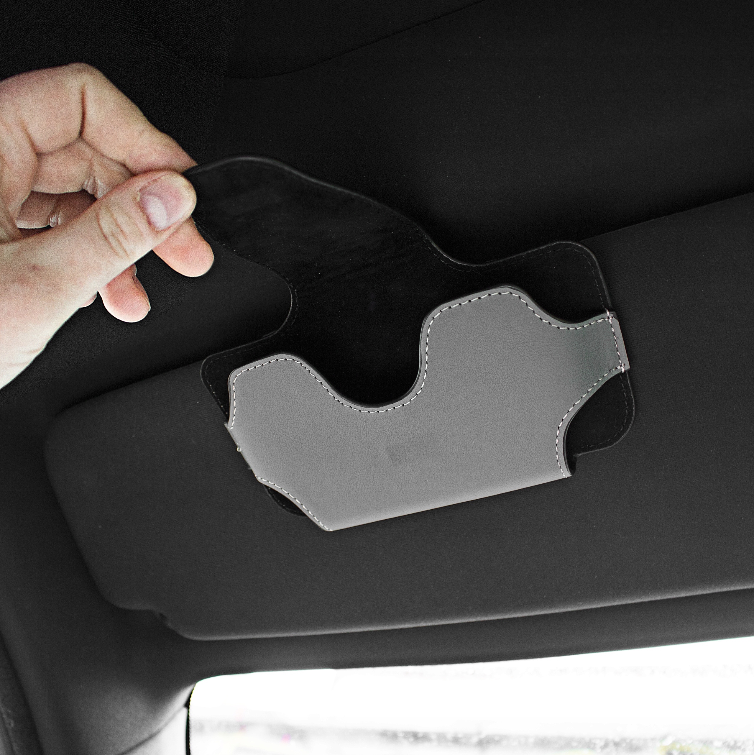 Чехол крепится к солнцезащитному козырьку с помощью эластичных ремешков. Кожаная внешняя поверхность и изящная внутренняя отделка эффективно защищают очки от повреждений. Заслонка закрывается магнитом для удобства эксплуатации.