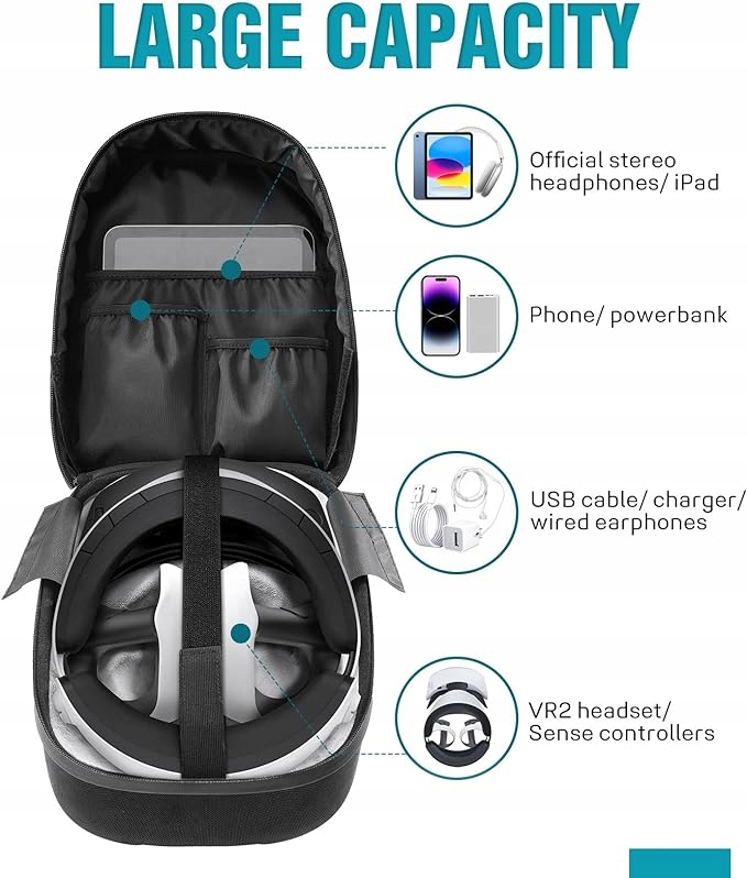 【Высококачественный вместительный футляр】 В этом прочном рюкзаке для консоли Playstation VR2 поместятся гарнитура PS VR2, USB-кабель и контроллер Sense. Кроме того, в нем можно безопасно хранить аксессуары для PS VR2 благодаря 3 дополнительным карманам. Вы можете одновременно брать с собой официально настроенные наушники, телефоны, внешний аккумулятор, зарядные устройства или небольшие аксессуары. Одного достаточно.