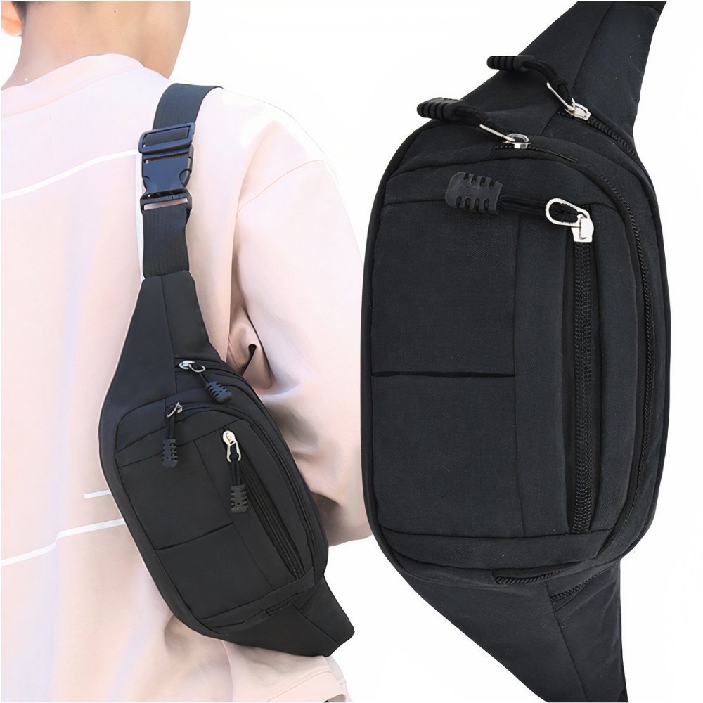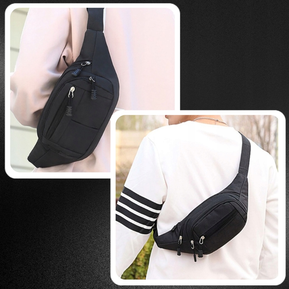 - Черная мужская поясная сумка с 4 карманами долговечна и устойчива к повреждениям.
