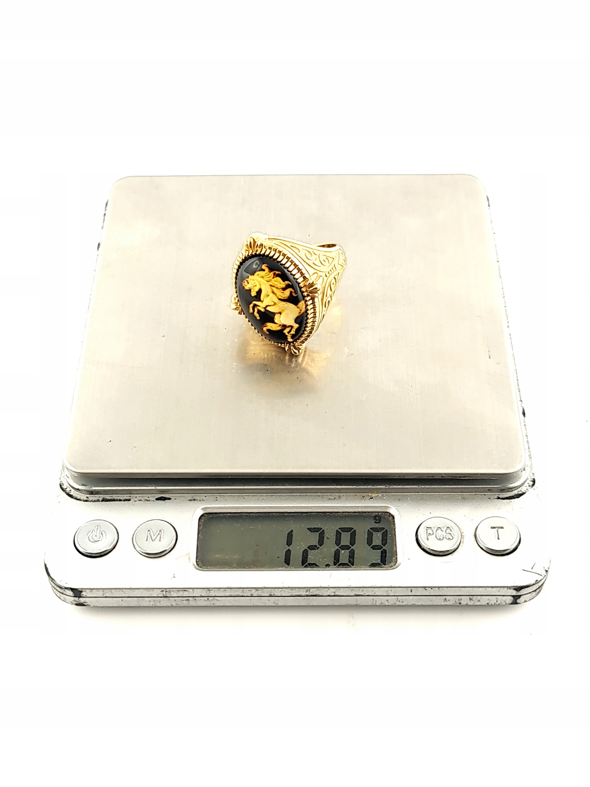 Красивая мужская перстень-печатка из позолоченного серебра высочайшего качества с резным конем из натурального балтийского янтаря.