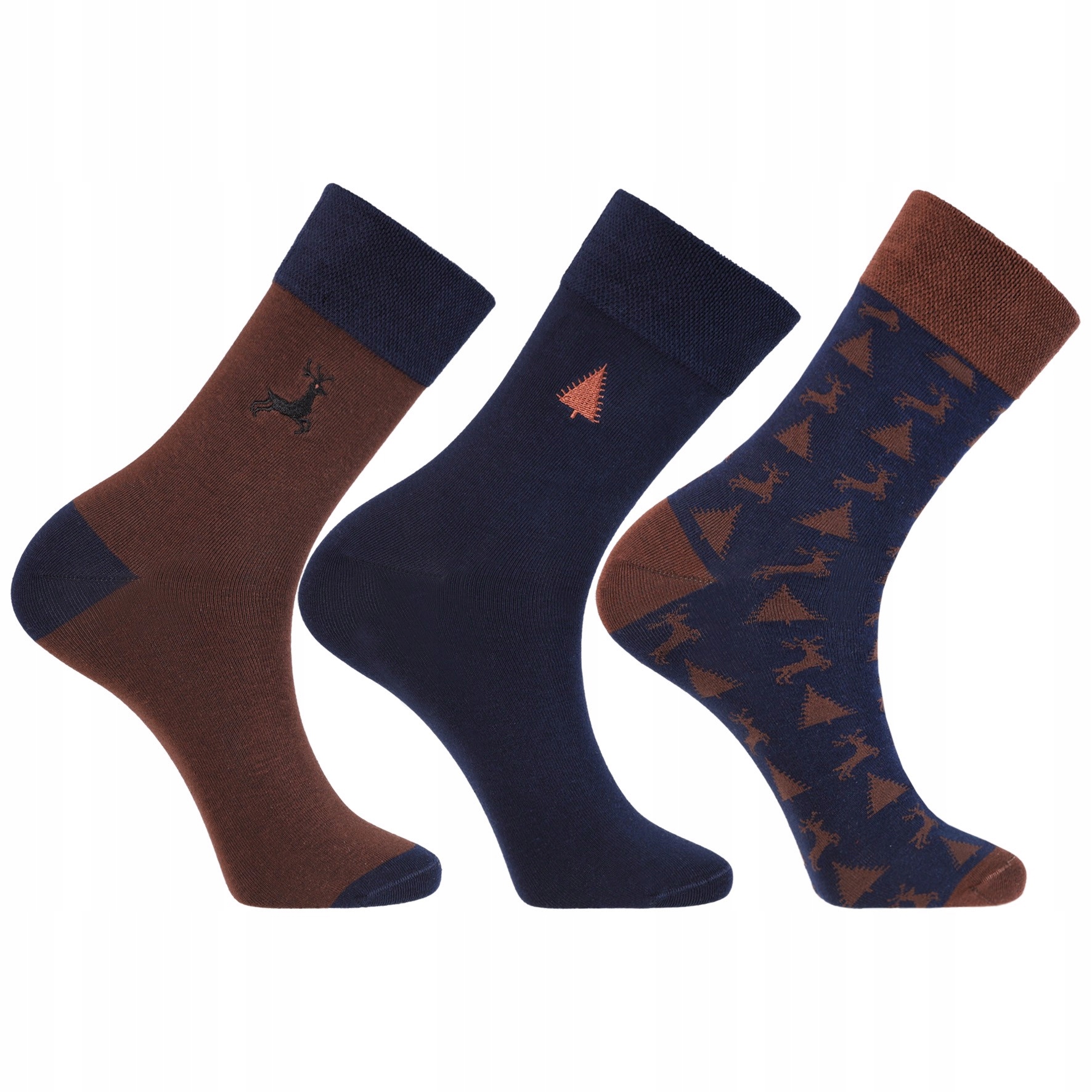 Набор из трех пар мужских носков с зимними и рождественскими мотивами – идеальный выбор для холодных дней и сезона отпусков. Оформленные в элегантных, приглушенных тонах (темно-синий, коричневый), с нежными узорами деревьев и оленей, они подойдут как к повседневному стилю, так и в качестве дополнения к рождественским комплектам.