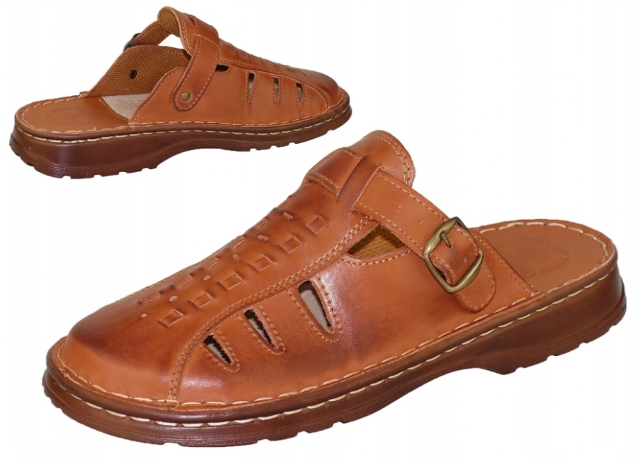 Польские мужские шлепанцы из натуральной кожи коричневого цвета. Украшен тонким перфорированным узором. Легкая, удобная модель с гибкой подошвой. Прошитый ободок.
