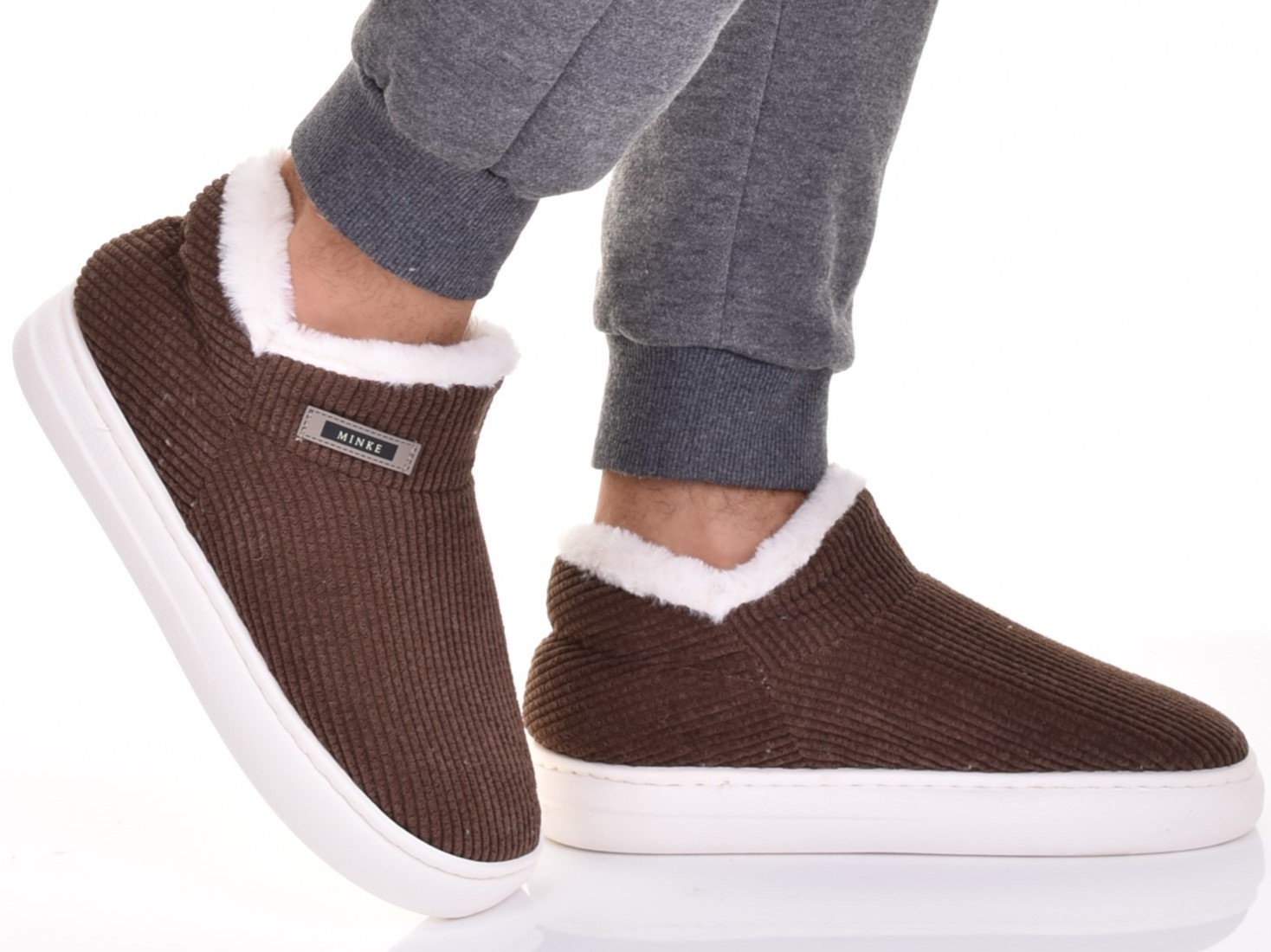 Полностью закрытые тапочки без шнуровки из очень мягкого и теплого материала, имитирующего вельвет, с декоративным мехом вокруг щиколотки.