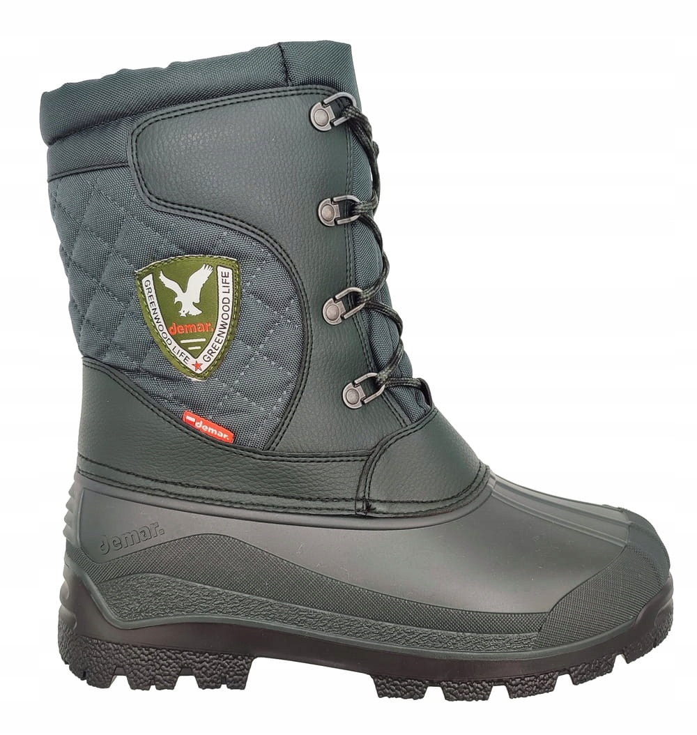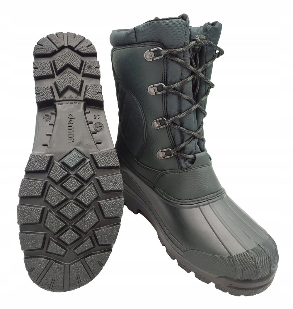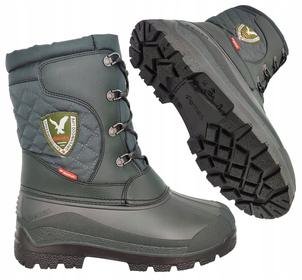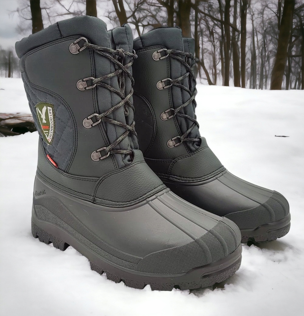 Снегоступы, охотничьи ботинки LOGAN/DEMAR. Очень удобная обувь с высоким голенищем для любых погодных условий, для охотников и рыбаков. Цвет: оттенки зеленого. Размер: 40 - 47. Модель имеет: высокий верх с защитой щиколотки, эффективно защищающей от холода и грязи, мягкий набитый воротник и вшитый язычок-сильфон, регулировку шнурками, благодаря которым можно идеально подогнать обувь по икре, дизайнерскую стежку и декоративную нашивку, сменную утеплительную вставку. Верх выполнен из комбинации износостойкого материала, напоминающего кожу, и полиэфирной ткани. Теплоизоляционные свойства сохраняются благодаря: сменной утепляющей вставке (100% шерсть), теплоизоляционному пенополиуретану, теплоизоляционному нетканому материалу. Подошва из терморезины гибкая и не меняет своих свойств при низких температурах. Это гарантирует очень хорошее сцепление как на мокрой поверхности, так и во время зимнего использования. Конструкция подошвы: подметка с алюминиевым слоем и термоизоляционным слоем из вспененного полиэтилена. Тепловые свойства зимних ботинок были протестированы при температуре до -50°C. Резной протектор не скользит, обеспечивая устойчивость и безопасность в неблагоприятных условиях, например, на неровных, скользких поверхностях в горных и лесных районах. Очень теплая и прочная обувь, водонепроницаемая, идеальна для передвижения по труднопроходимой местности, независимо от погоды. Они отвечают требованиям даже самых требовательных любителей зимних экспедиций.