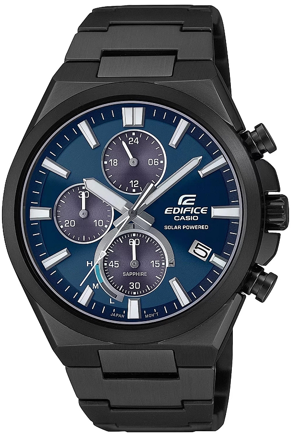 Мужские часы CASIO EFS-S630DC-2AVUEF оснащены надежным кварцевым механизмом, работающим от солнечной батареи, поэтому не требуют замены батарейки. Индикаторы заряда имеют маркировку H, M, L на циферблате. Корпус полностью изготовлен из высококачественной нержавеющей стали – устойчивой к истиранию, оксидированной в черный цвет с использованием прочного метода PVD. Стальной браслет сделан прочно, дополнен тройной застежкой, которая предотвращает его расстегивание во время использования. На циферблате расположены три небольших циферблата - два из них выполняют функцию аналогового секундомера в виде хронографа (точность от 1/1 секунды до 30 минут), третий показывает ежедневное время и указатель даты с указанием дня недели. месяца находится в 4:00.