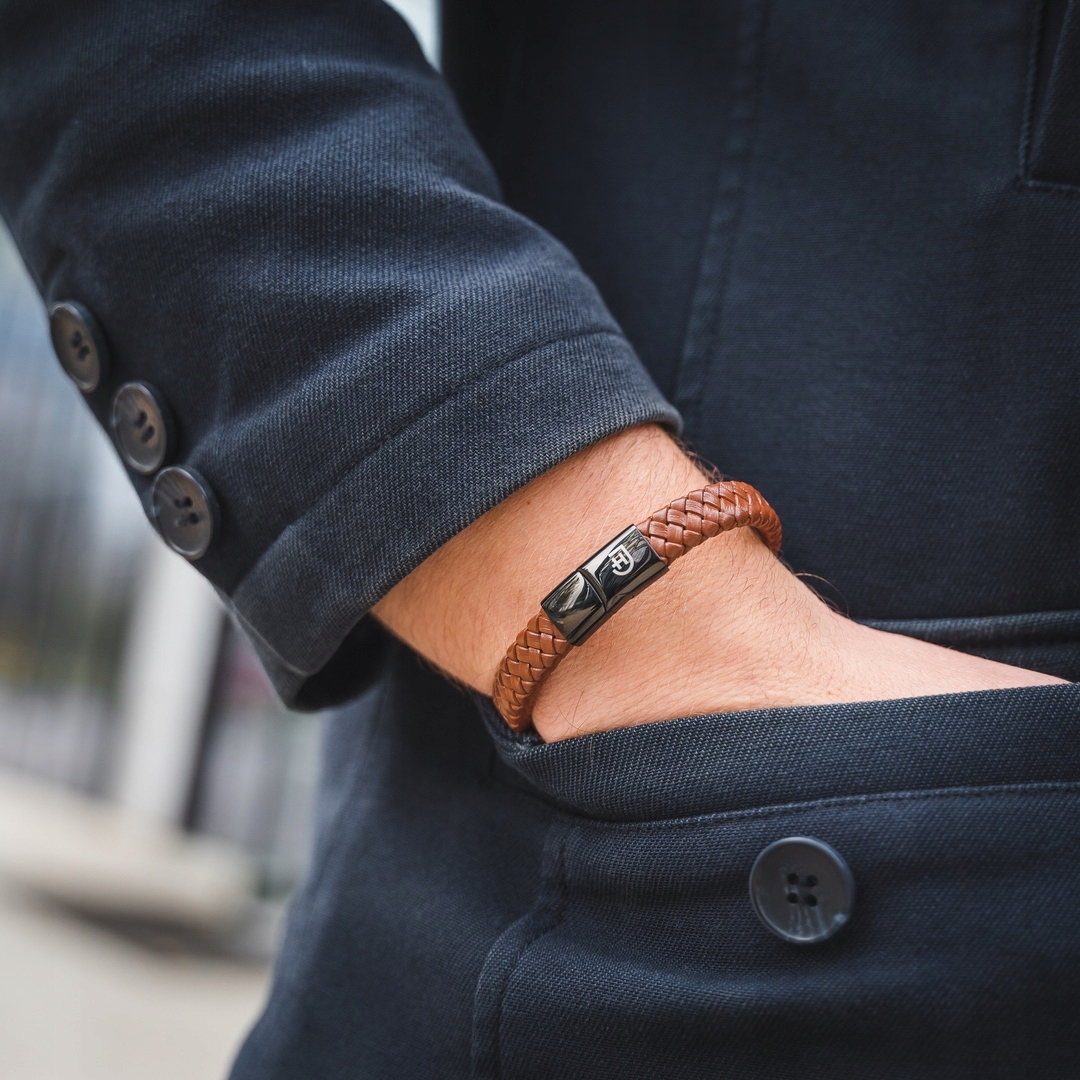 Чоловічий плетений шкіряний браслет з металевою пряжкою
