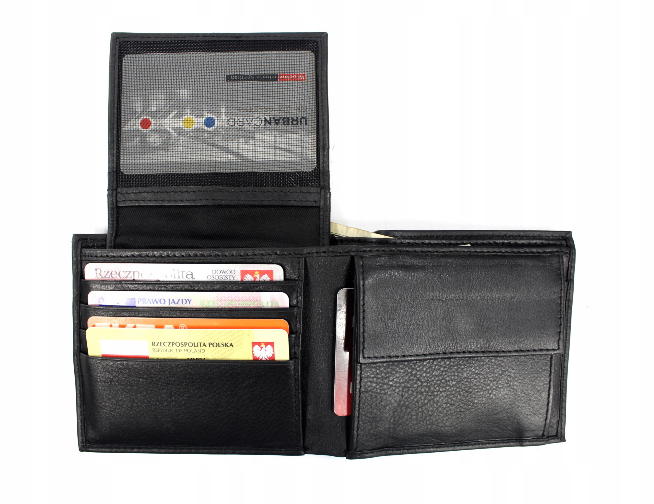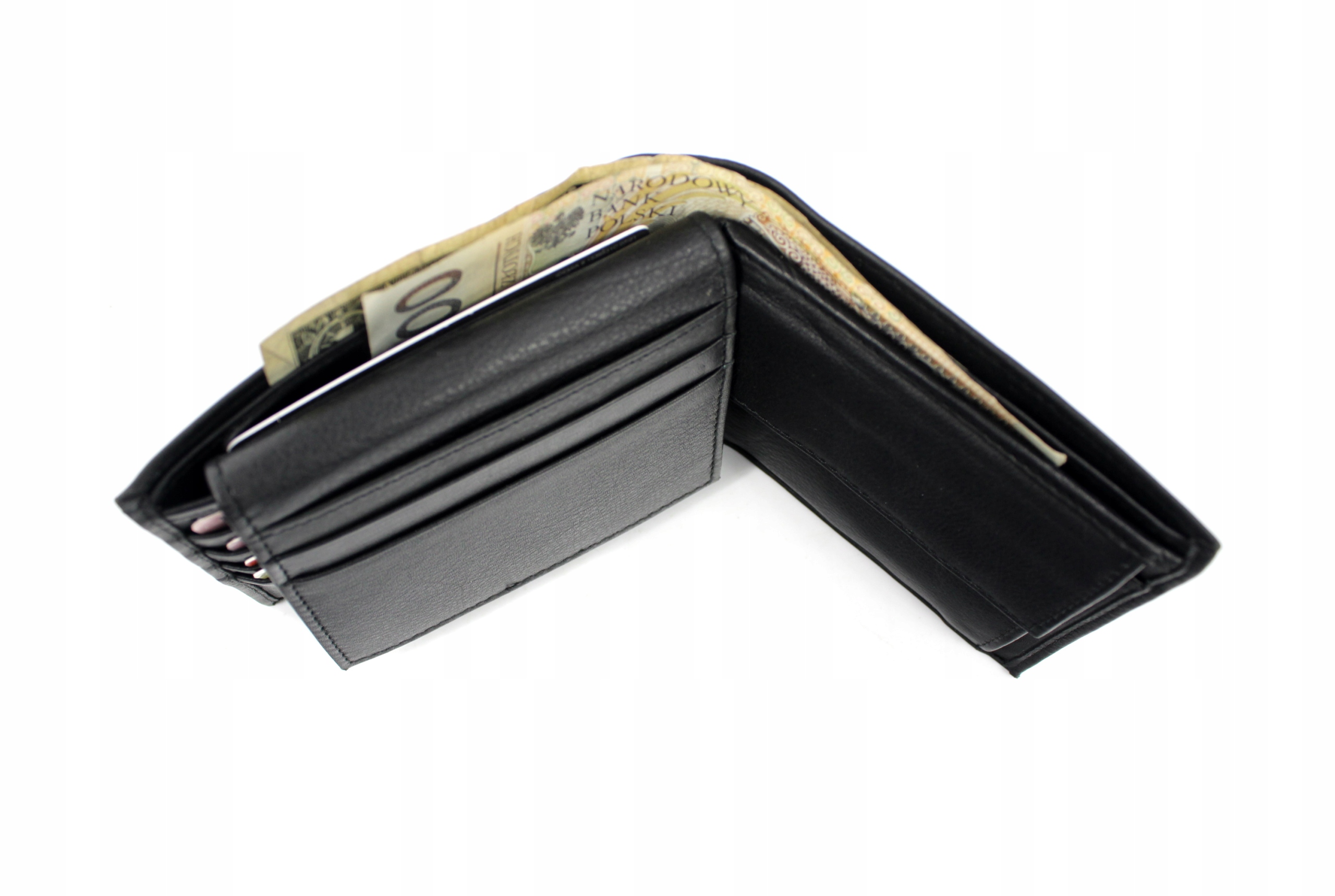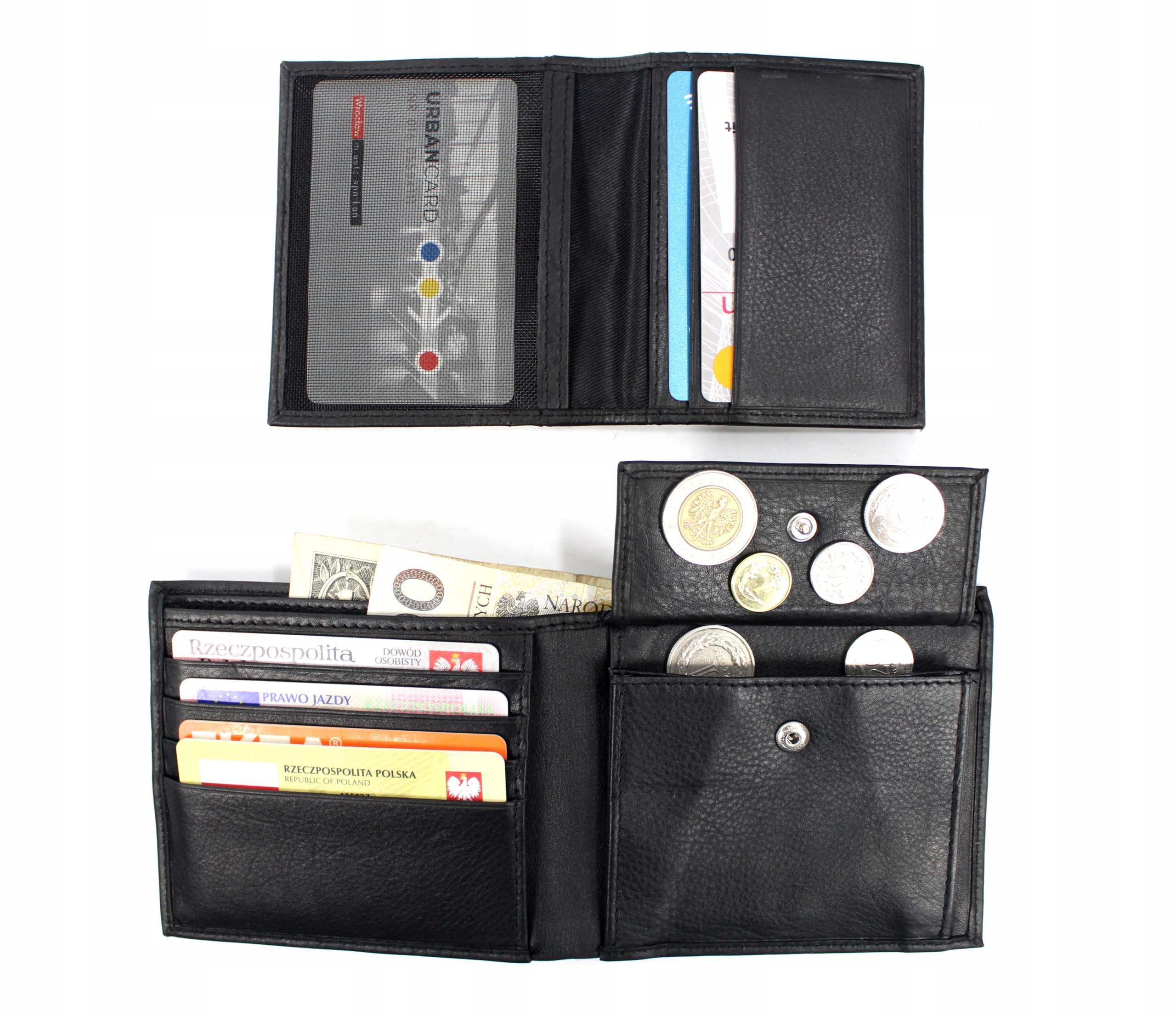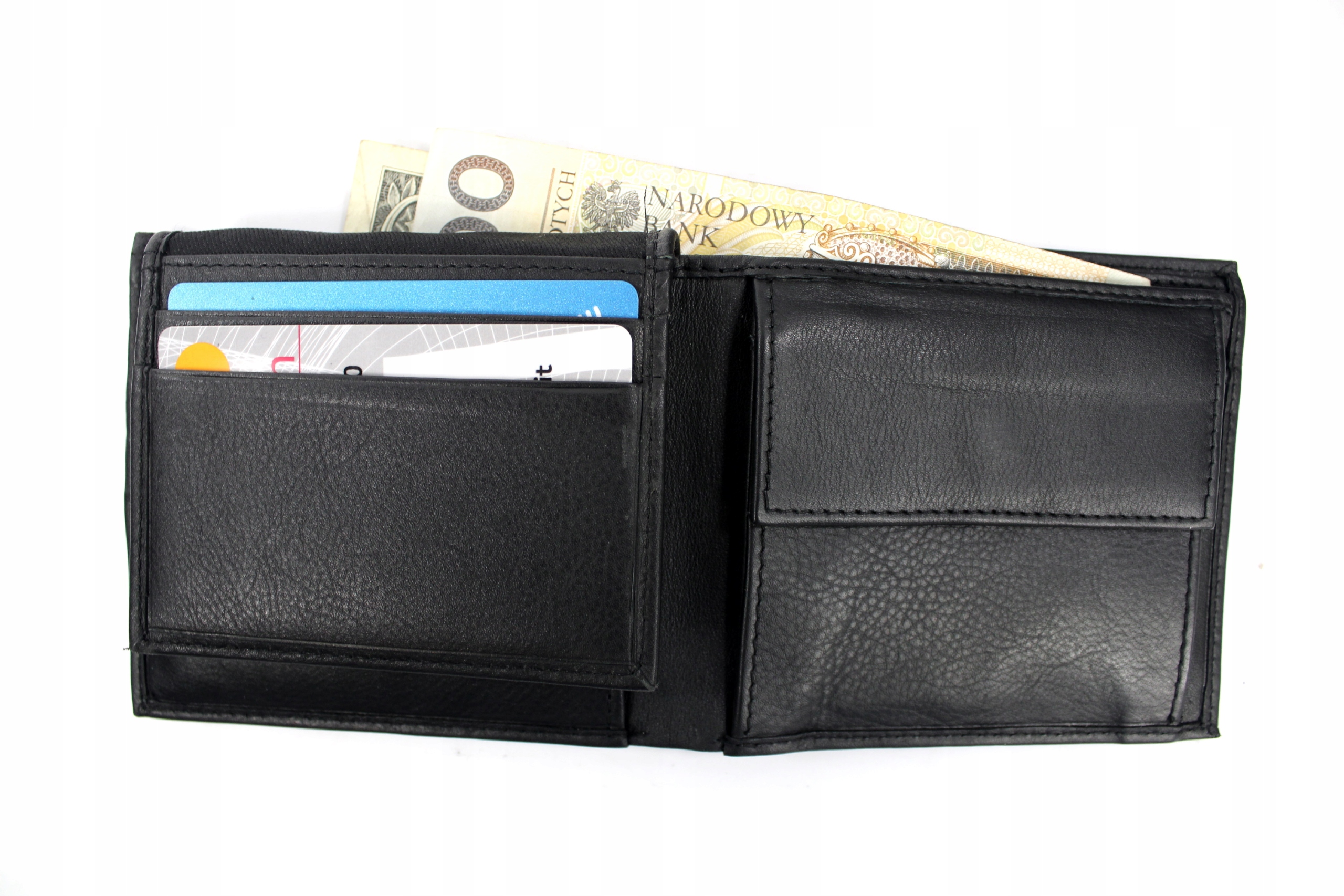 В середине кошелька, с правой стороны, расположены 4 отделения для платежных карт или документов, удостоверяющих личность, а также большой плоский карман. С левой стороны расположен карман для монет, застегивающийся на кнопку, а под ним еще один плоский карман. Сверху кошелька также есть доступ к 2 отделениям для купюр. В кошельке также имеется отдельный съемный футляр для платежных карт.