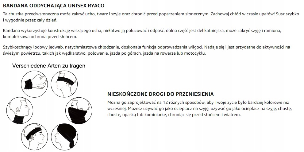 Просматривая «Чоловічий/жіночий шарф Ryaco, багатофункціональний Ryaco», вы можете быть уверены, что данный товар из каталога «Остальные» будет доставлен из Польши и проверен на целостность. В цене товара, указанной на сайте, учтена доставка из Польши. Внимание!!! Товары для Евросоюза, согласно законодательству стран Евросоюза, могут отличаться упаковкой или наполнением.