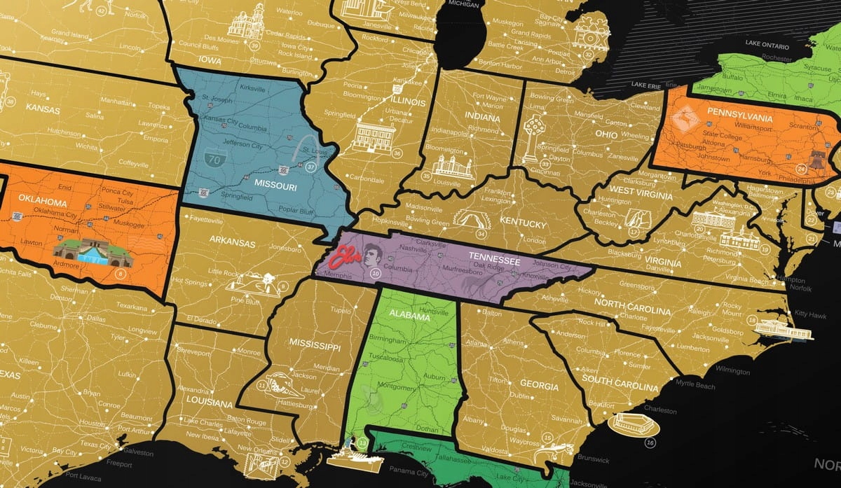 Travel Map™ USA Black — это черная карта Соединенных Штатов с золотым скретч-покрытием. Вы можете легко отметить на карте государства, которые вы посетили, и найти их символы. Просто используйте прилагаемые игральные кости, чтобы достать золотую скретч-карту и открыть для себя места, где вы уже были, создав впечатляющую запись своих путешествий по США. Карта подходит для современных и креативных интерьеров. Также подойдет в качестве подарка любителям США.