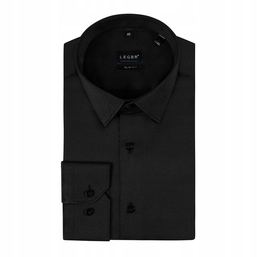 Элегантная мужская рубашка черного цвета. Застегивается на пуговицы. Изготовлен из плотного сатина - абсолютно непрозрачный. Небольшая добавка эластана позволяет рубашке лучше сидеть по фигуре. Он прекрасно дополнит любой формальный стиль. Прекрасное дополнение к костюмам и курткам Leger.