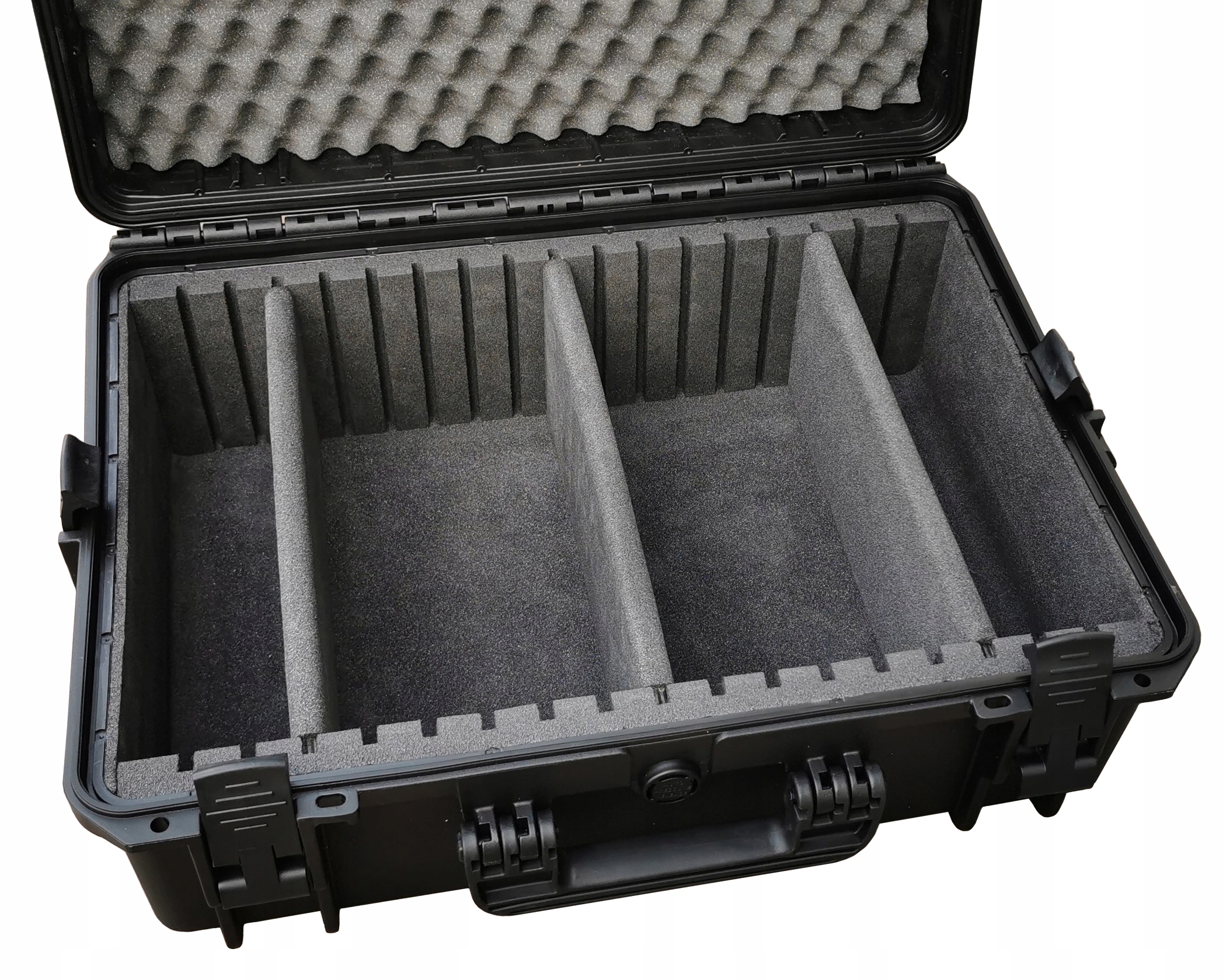 - внутренний покрыта амортизирующей пеной с системой регулируемых, выдвижных отделений (внутренние размеры после покрытия: 370мм х 230мм х 90мм),
