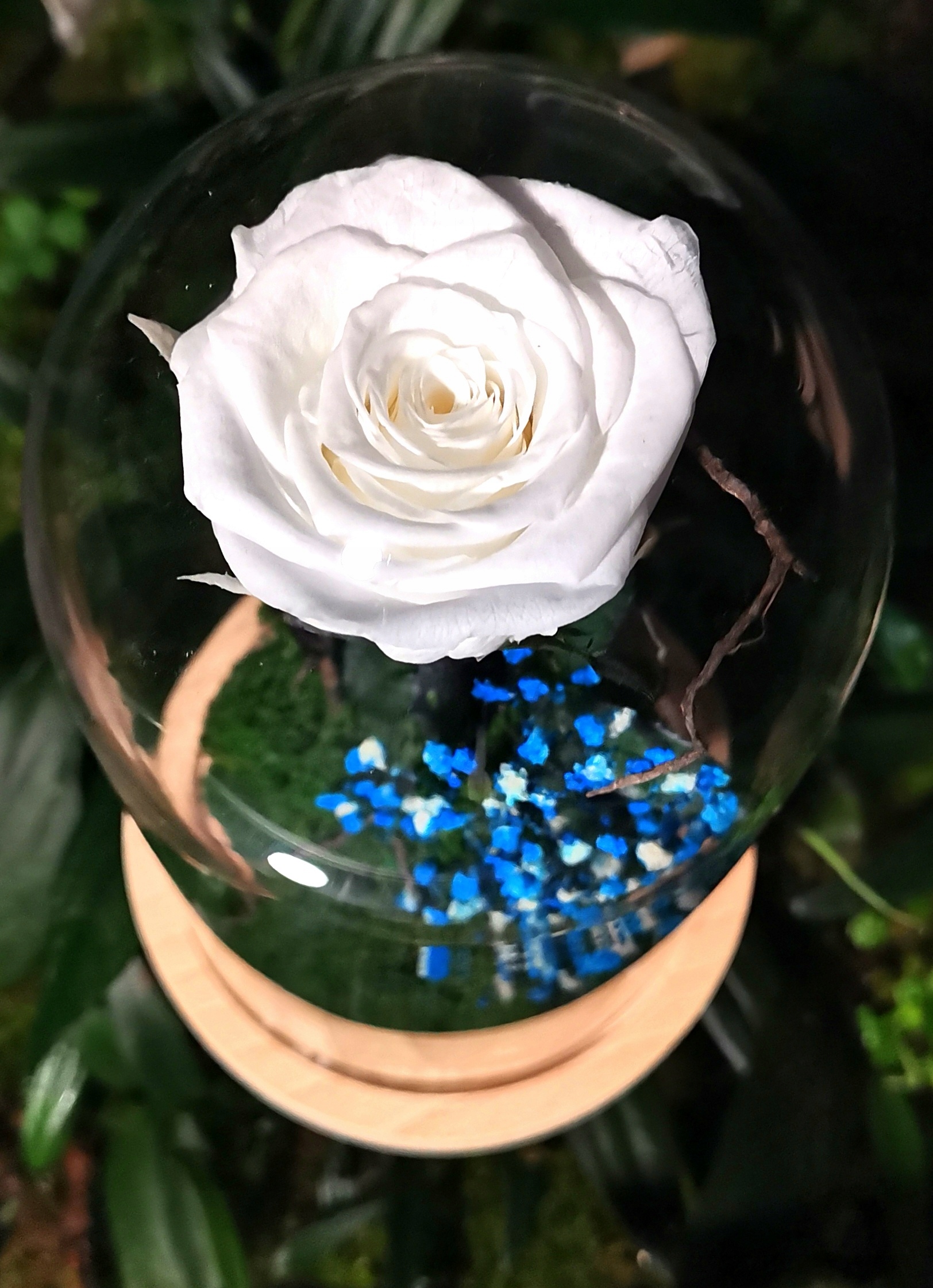 Настоящая черная вечная роза в стеклянном куполе с мхом Хроботек, стабилизированная гипсовыми корнями или корнями, окрашенными в золото или серебро. Эта композиция обеспечивает естественную красоту примерно на 2 года. Чтобы наслаждаться своим внешним видом, он не требует никакого ухода. Мы сами создаем композиции из качественных цветов. И головка, и стебель, и листья розы настоящие и прошли процесс консервации.