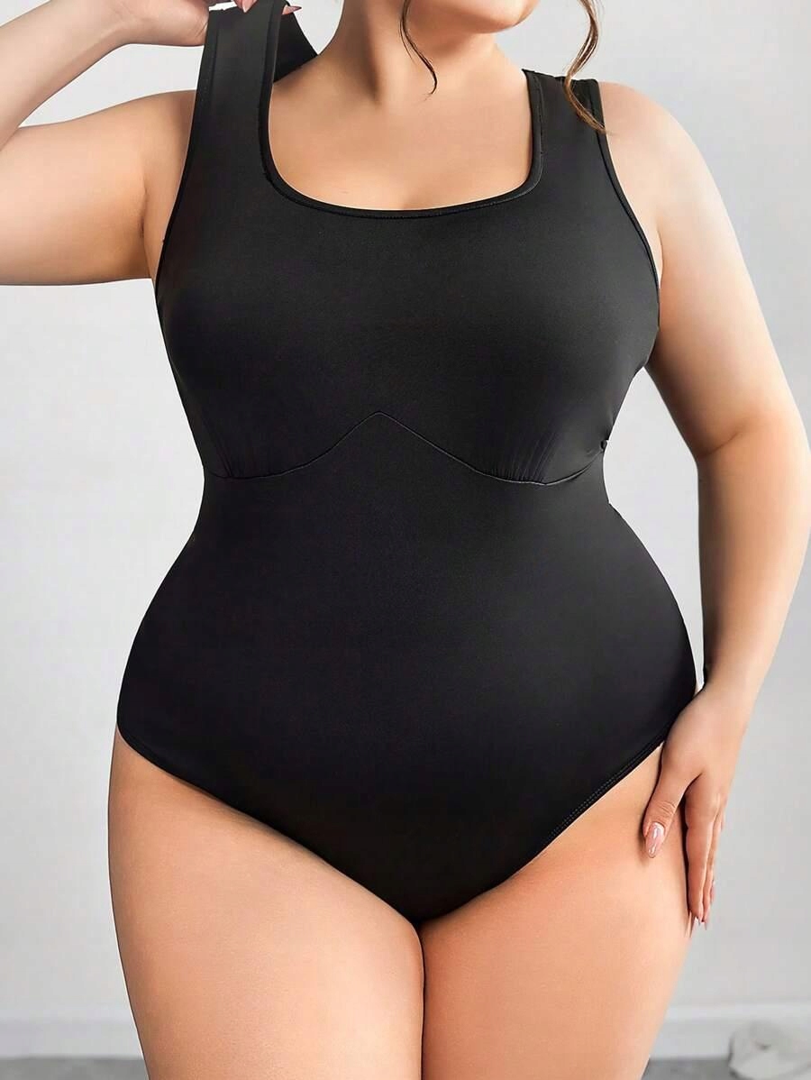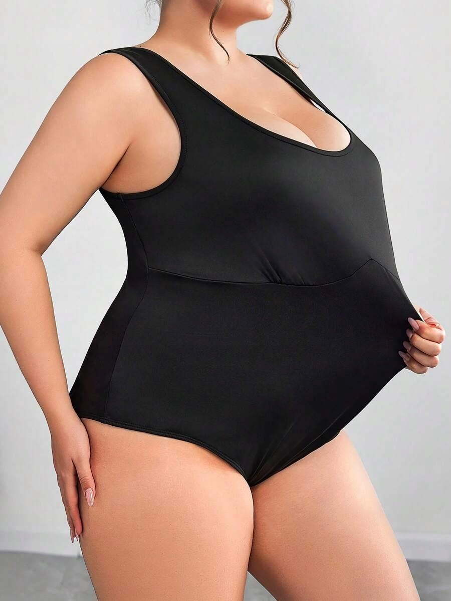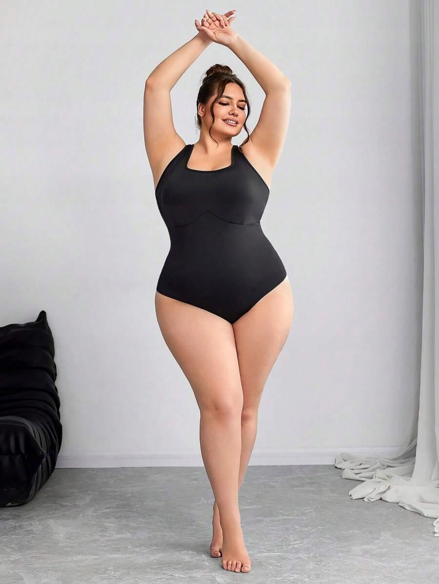 ЧЕРНОЕ КЛАССИЧЕСКОЕ ГЛАДКОЕ БОДИ НА ТОЛСТЫХ ЛЕМЯХ, ПРИТЯЖЕННОЕ SHEIN 60