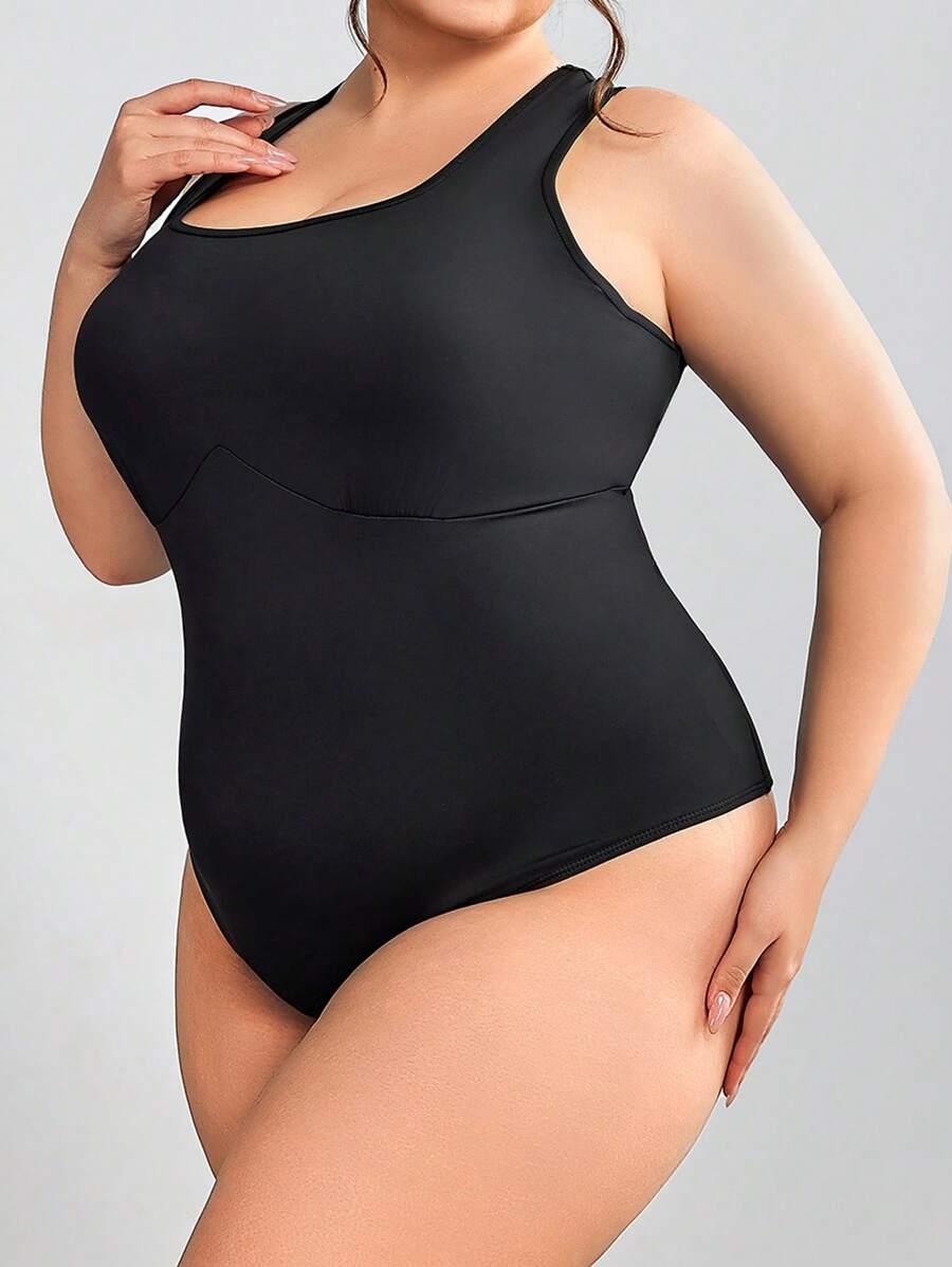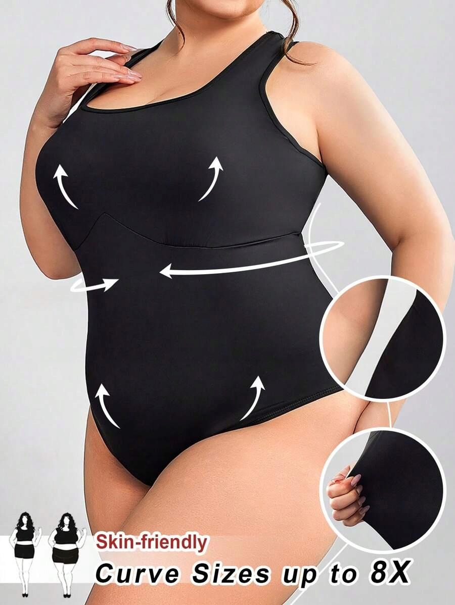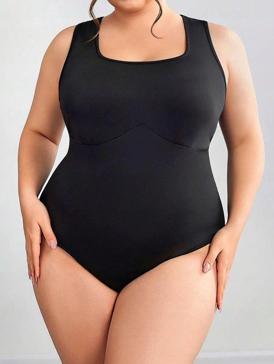 ЧЕРНОЕ КЛАССИЧЕСКОЕ ГЛАДКОЕ БОДИ НА ТОЛСТЫХ ЛЕМЯХ, ПРИТЯЖЕННОЕ SHEIN 60