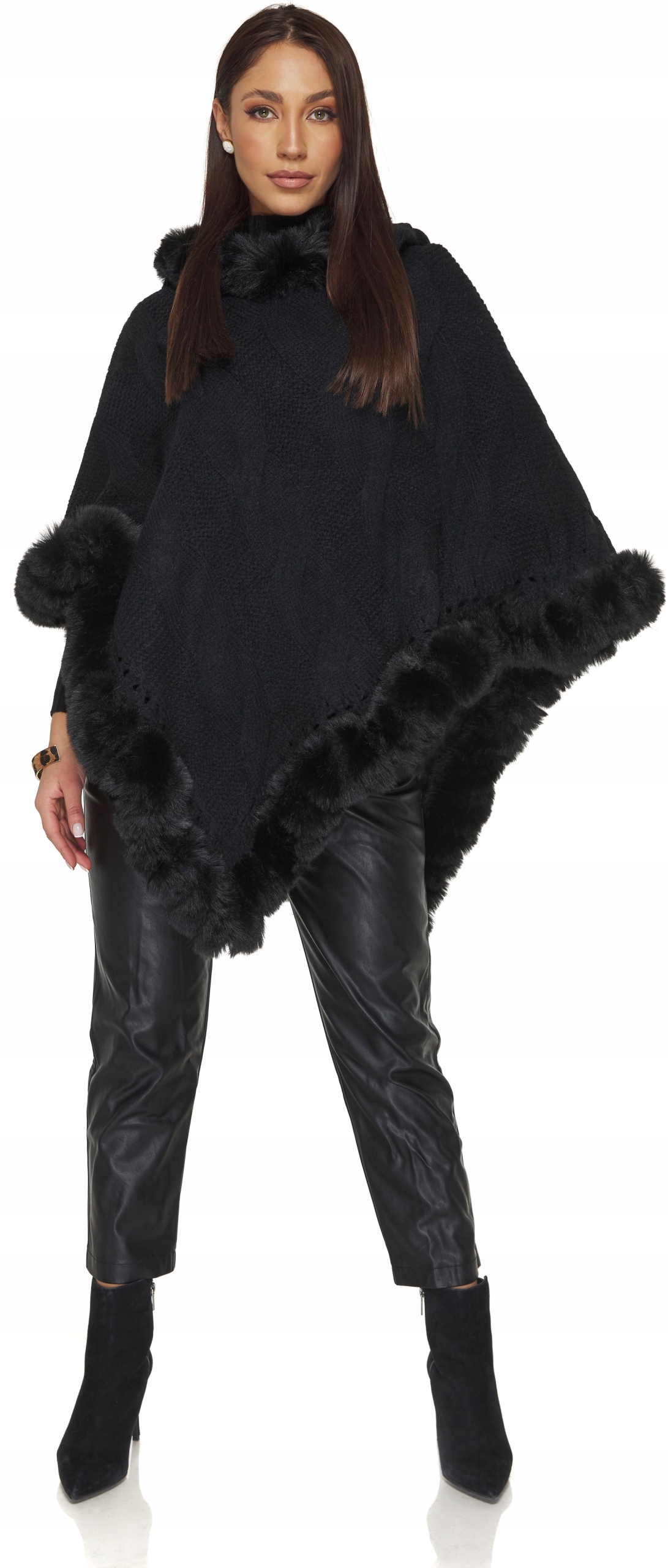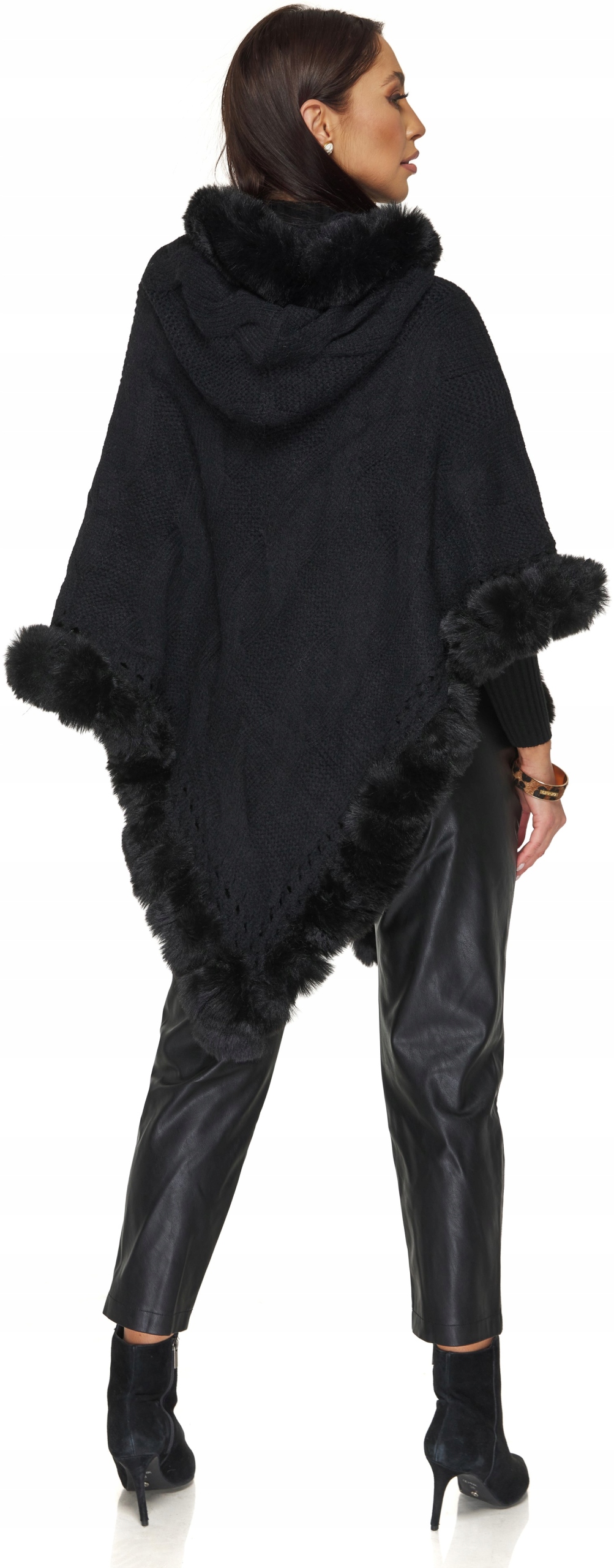 ЧОРНЕ В'ЯЗАННЕ ПОНЧО ПОНЧО З ХУТРЯНИМ КАПЮШОНОМ