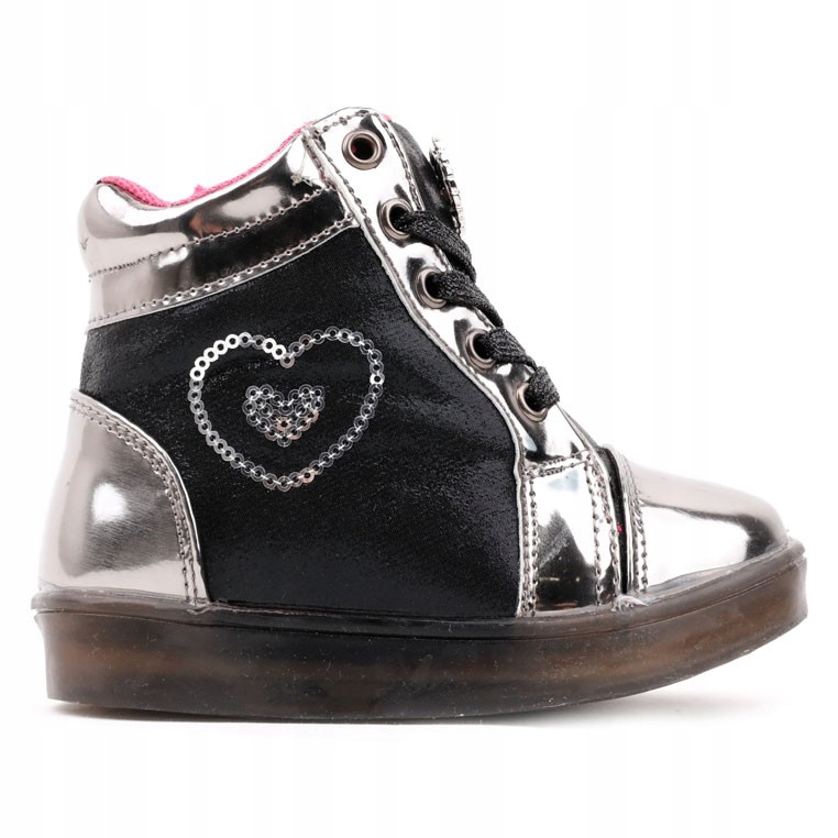 Кроссовки, туфли для девочек на плоской подошве. С верхним окончанием выше щиколотки. Сбоку украшено сердечком. Круглый лакированный нос. Изготовлен из блестящего материала в сочетании с лакированной кожей. Застегивается на молнию изнутри, спереди на шнуровке.
