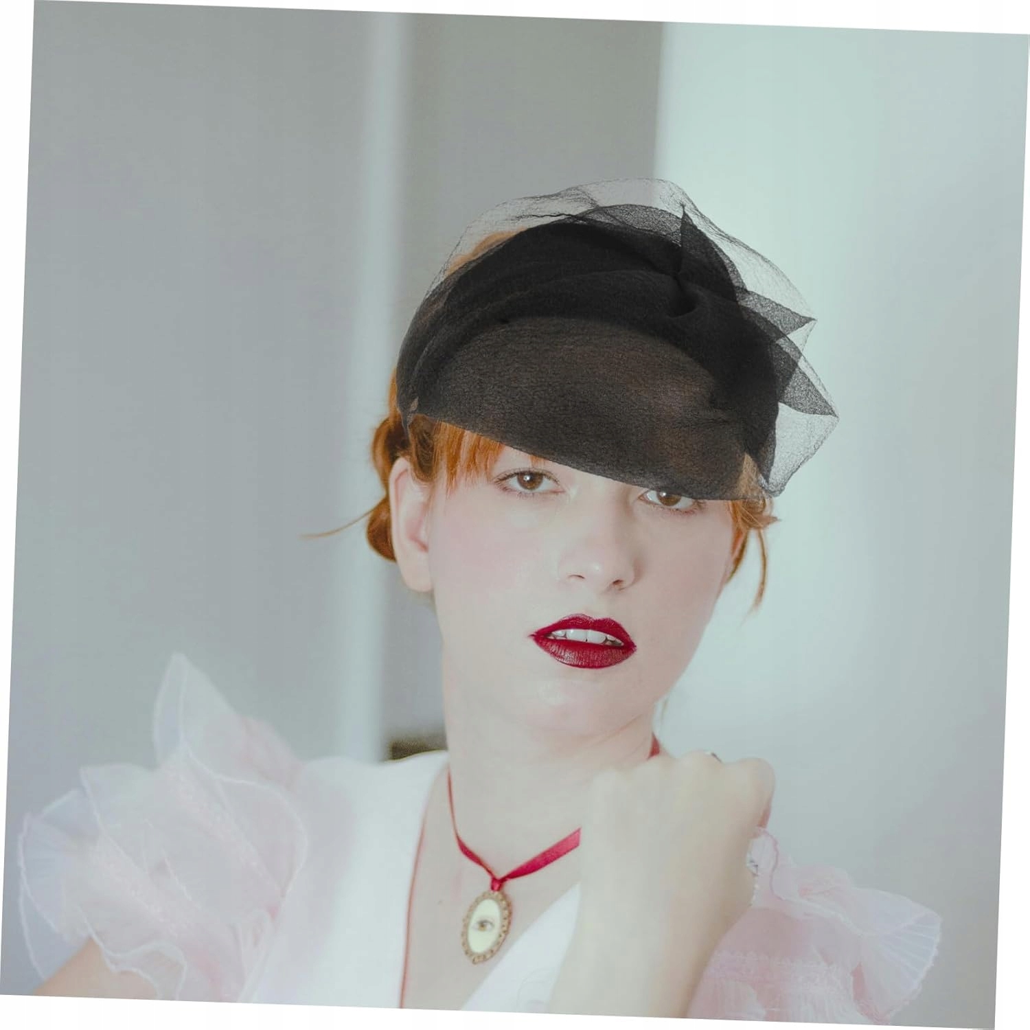 Полушапка декорирована нежной сеткой, что делает ее идеальной для официальных случаев.