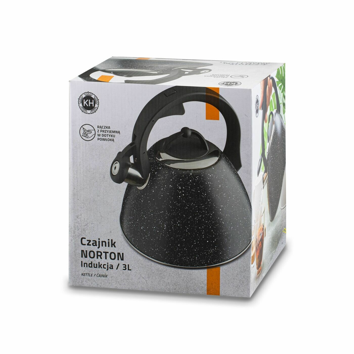 Чайник Konighoffer Norton 3L Black из нержавеющей стали имеет мягкое покрытие, которое не нагревается и не скользит. Конструктивные решения защищают пользователя от случайных ожогов рук. Рукоятка soft touch имеет механизм бесконтактного подъема и опускания свистка. Конструкция обеспечивает энергосберегающее приготовление кипятка и защищает чайник от перегрева. Очистка и удаление накипи не требует особых усилий. Вскипятить воду на газовой плите можно так же эффективно, как и на индукционной. Общий объем модели Norton составляет 3 литра. Свисток всегда своевременно напомнит вам о кипящей воде. Декоративные качества изделия были получены благодаря современной форме и отделке чайника. Силиконовый заварник для чая на чашку входит в комплект. Он имеет форму фрукта и хвостик, который позволяет легко снимать его, не боясь обжечься.