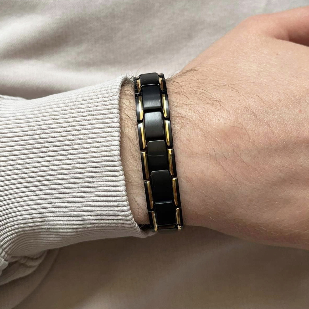 Магнитный браслет изготовлен из высококачественной хирургической стали 316L,позолочен со вставками 18-каратное золото по краям звеньев, придающее браслету элегантный и современный вид. Все это отполировано до глянца.