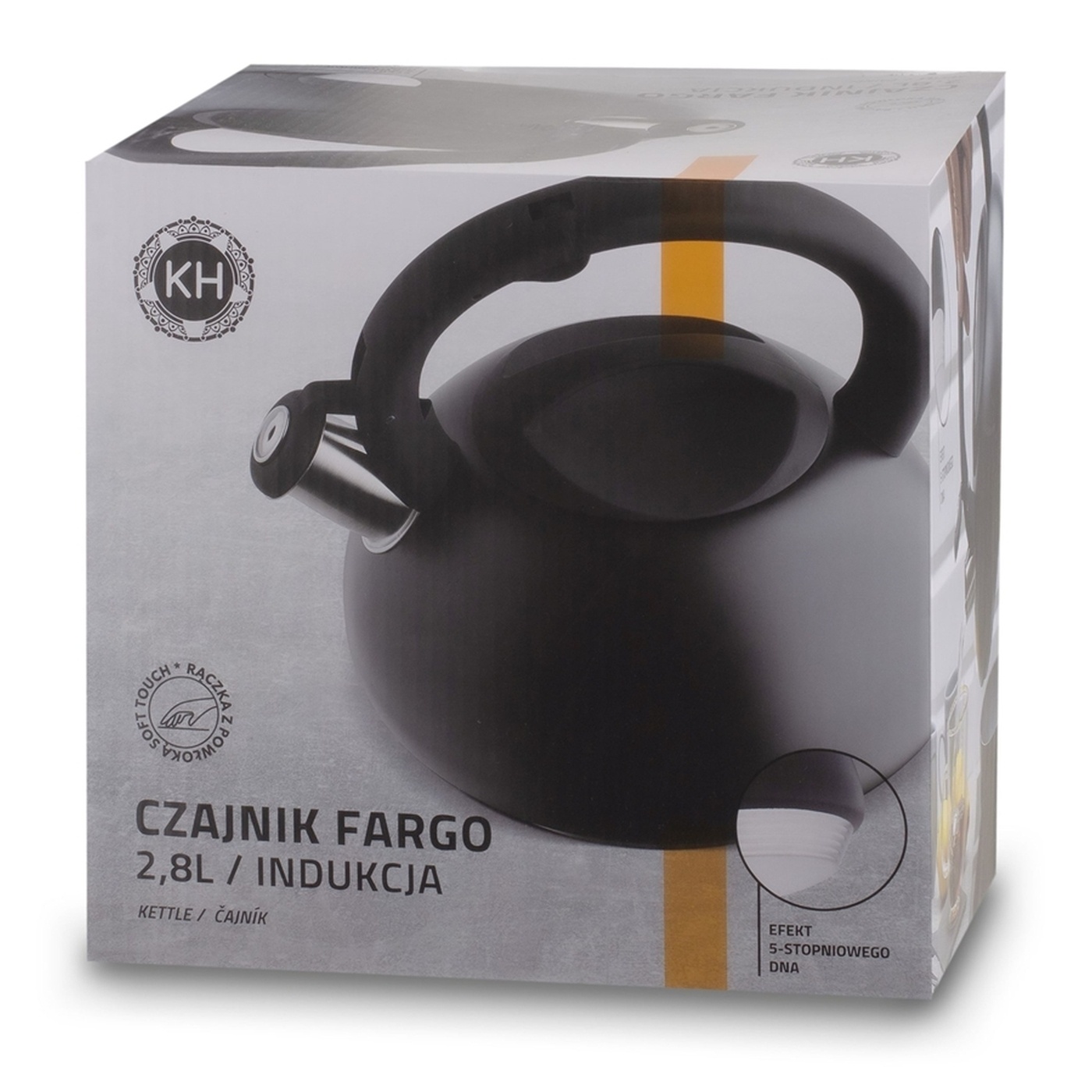 Черный чайник Konighoffer Fargo II из нержавеющей стали объемом 2,8 л отлично смотрится на плите и становится стильным кухонным оборудованием. Съемная крышка и свисток с механизмом в ручке-холодильнике облегчают приготовление напитков и обеспечивают безопасность. Нержавеющая сталь обеспечивает чайнику долговечность и стойкость, а также бережет здоровье ваших близких (не влияет на свойства воды). Приятная на ощупь и нескользящая ручка Soft Touch сочетается с корпусом, поскольку она тоже черного цвета. Одной руки достаточно, чтобы наполнить чайник или разлить кипяток по чашкам. Оригинальная и самобытная форма корпуса разнообразит ваше кухонное оборудование.